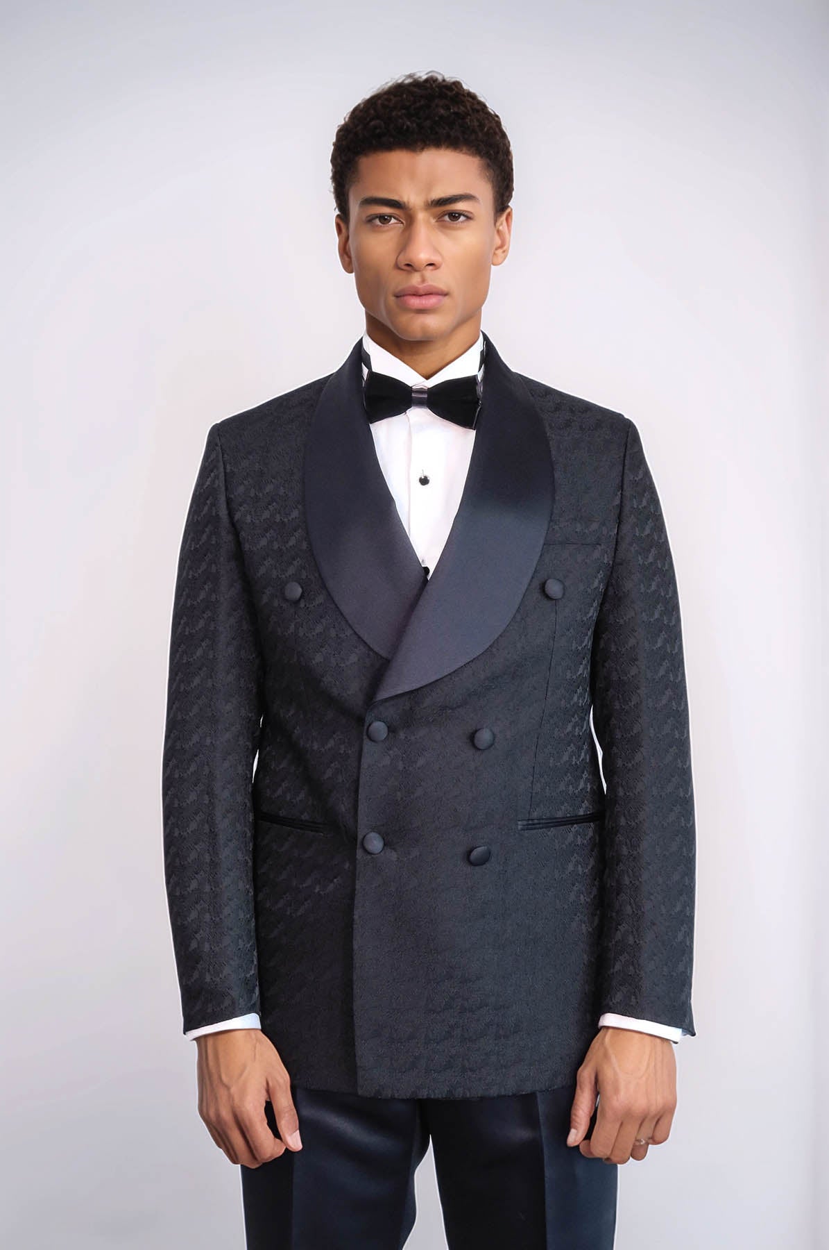 WSS Satin Shawl Collar Patterned Double Breasted Black Men Tuxedo Suit - Sydney