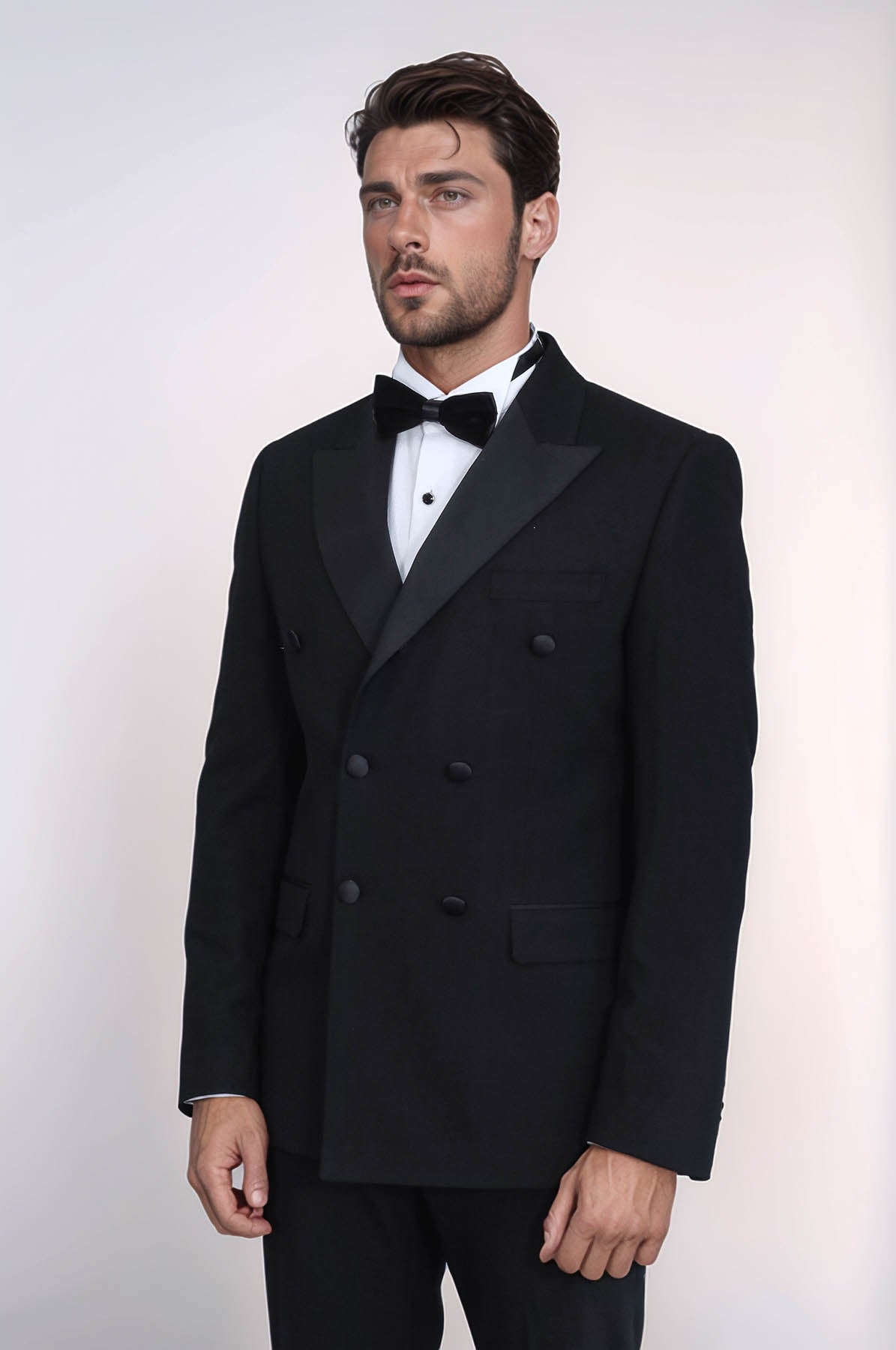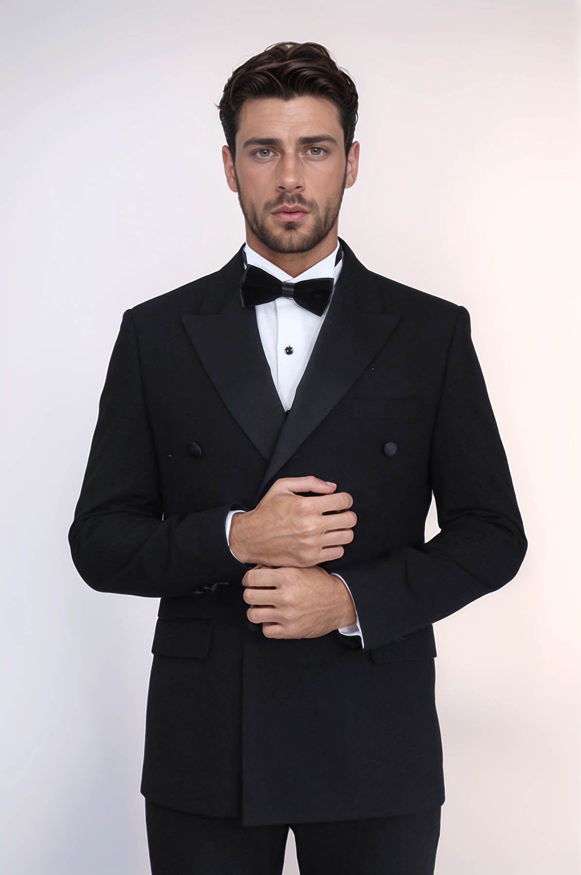 WSS Slim Fit Double-Breasted Black Tuxedo Suit with Satin Lapel – - Macuspana