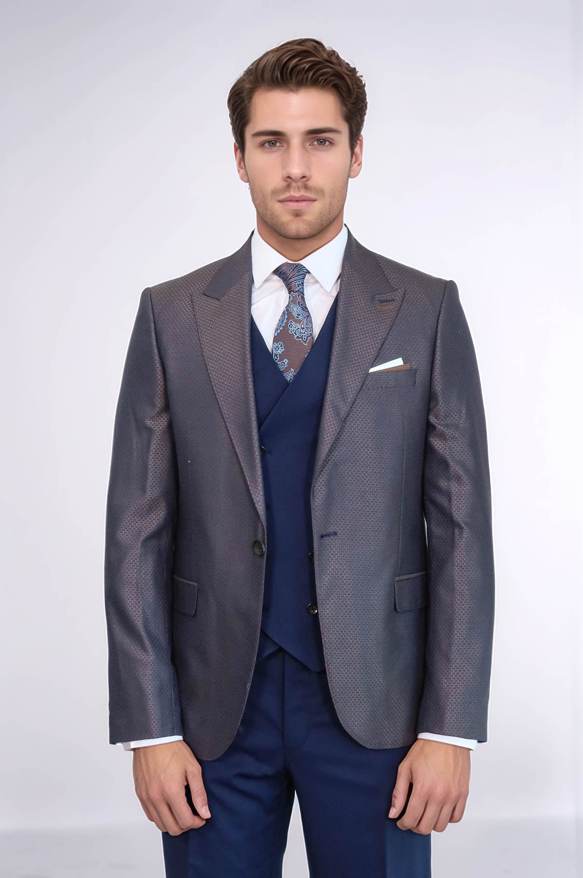 It is a suit with a few features that are rarely seen as a combination. It includes a jacket as well as a vest. It is possible to say that the slim fit molded jacket adds a nice air to the suit with a navy-purple mixture color. Other details of our self-patterned suit can be counted as single button, pointed collar and vest. It also clearly carries everything that should be in a suit, with a pocket handkerchief.