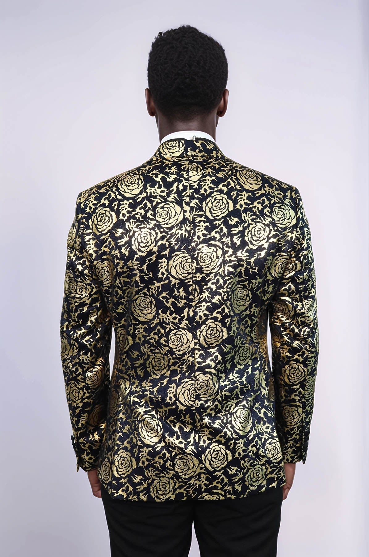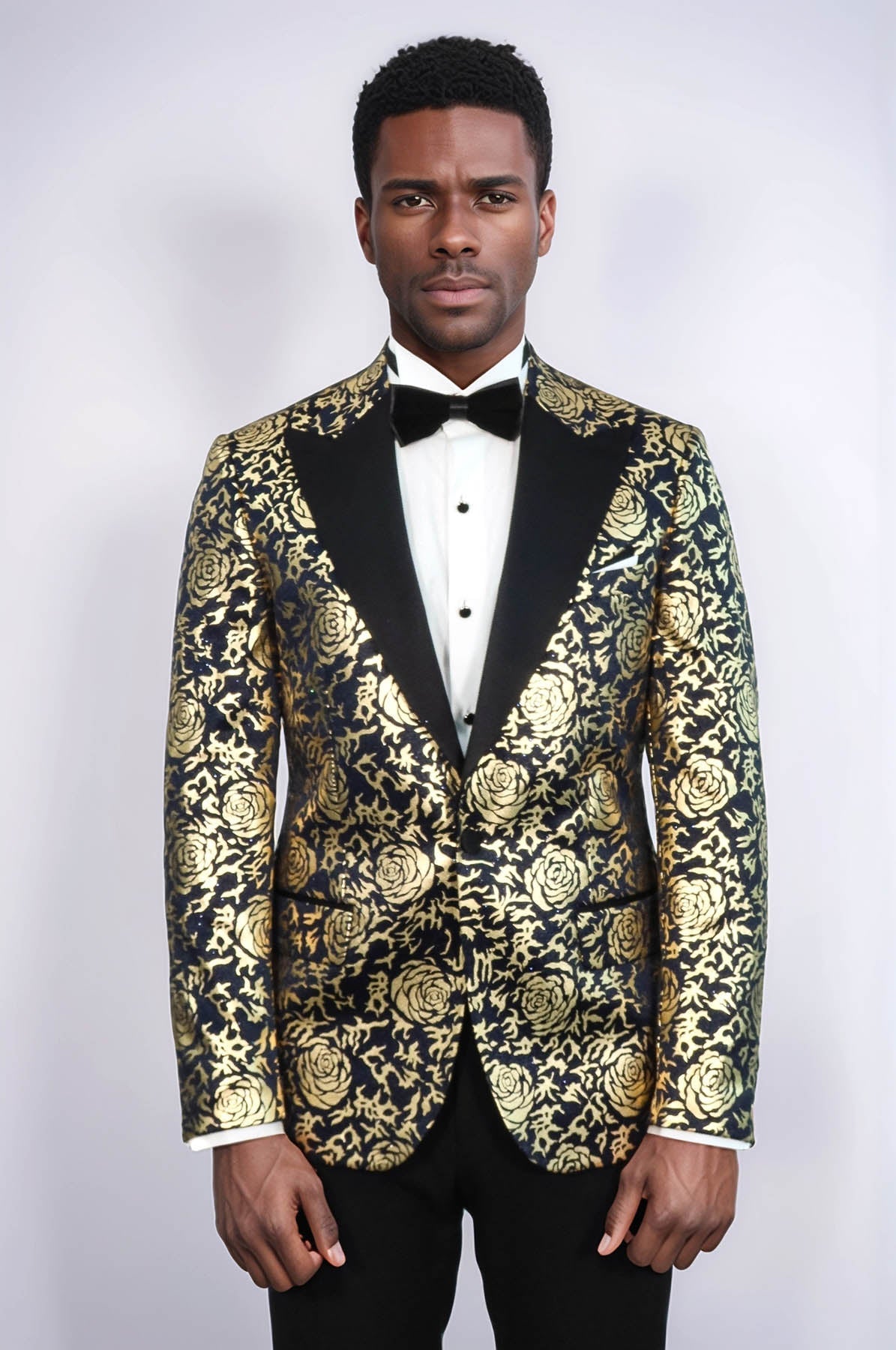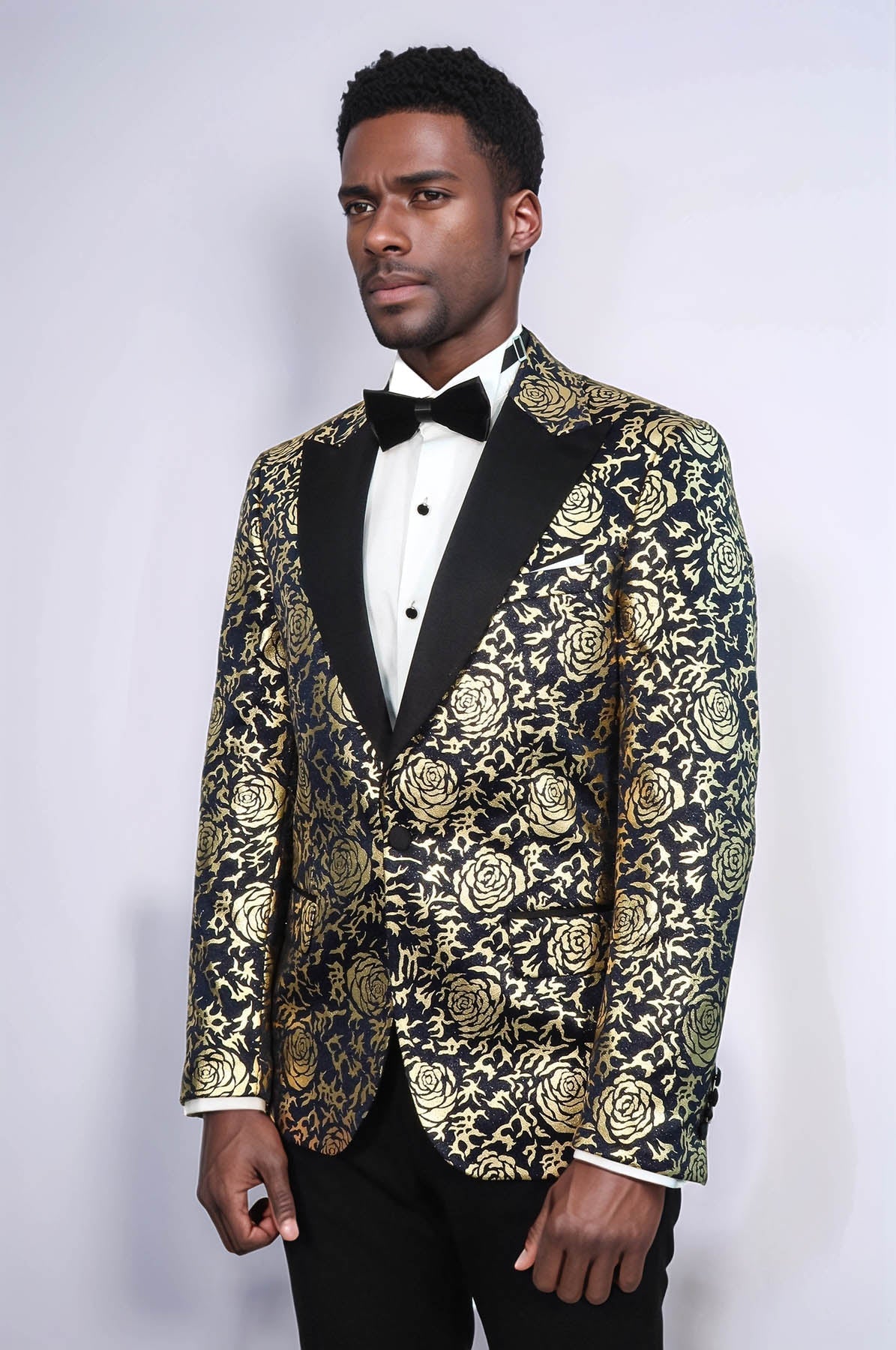 WSS Gold Rose Patterned Slim Fit Navy Blue Men Prom Blazer and Trousers Combination Suit - Ciudad Real