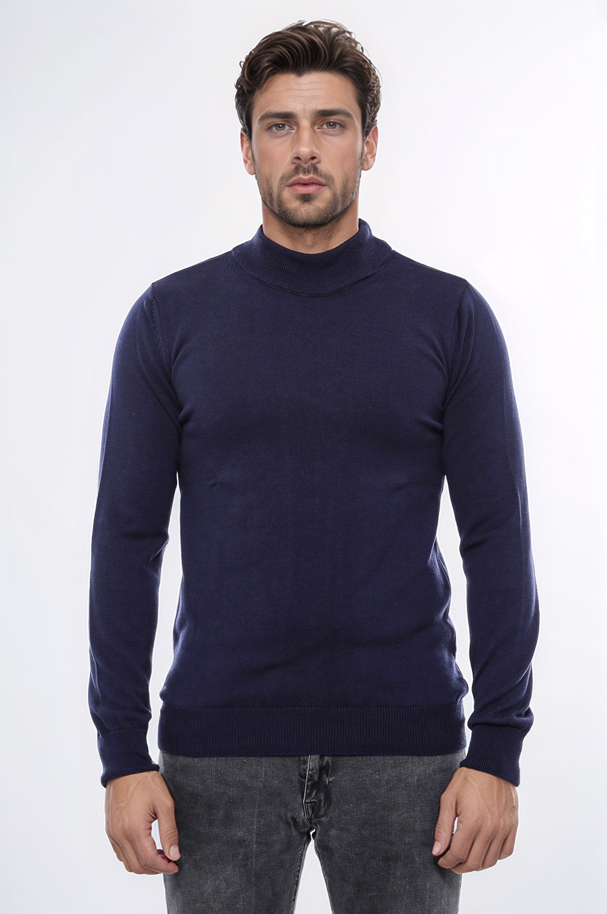 Effortlessly elevate your winter wardrobe with our Half Turtleneck Knitwear Navy Blue Men Sweater from Wessi. Crafted from high-quality materials, this sweater offers a sleek and modern look with a comfortable half turtleneck design. Stay warm and stylish this season with Wessi.