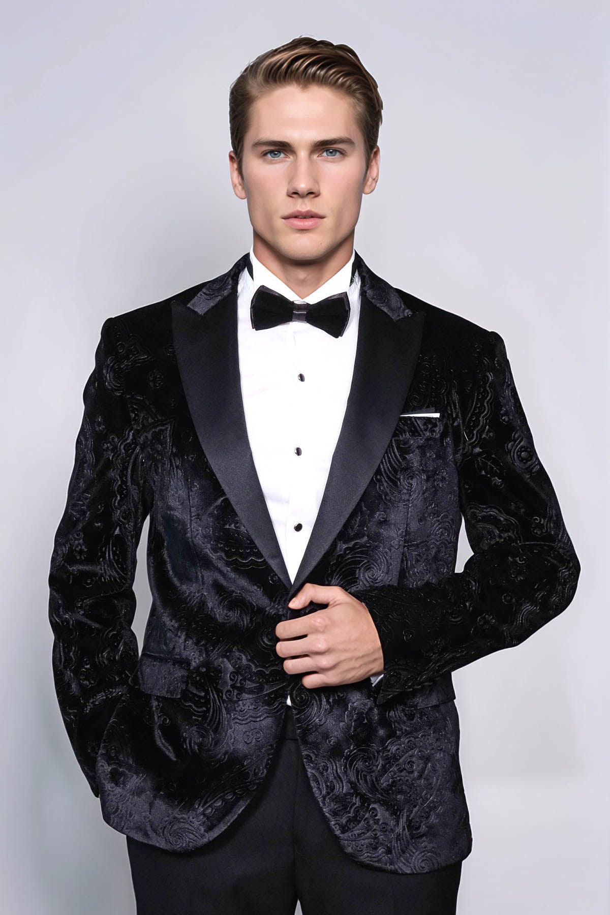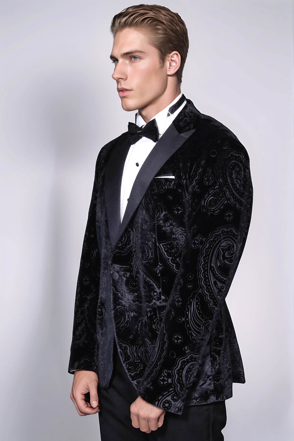 WSS Floral Patterned Velvet Black Men Prom Blazer and Trousers Combination Suit - Wels