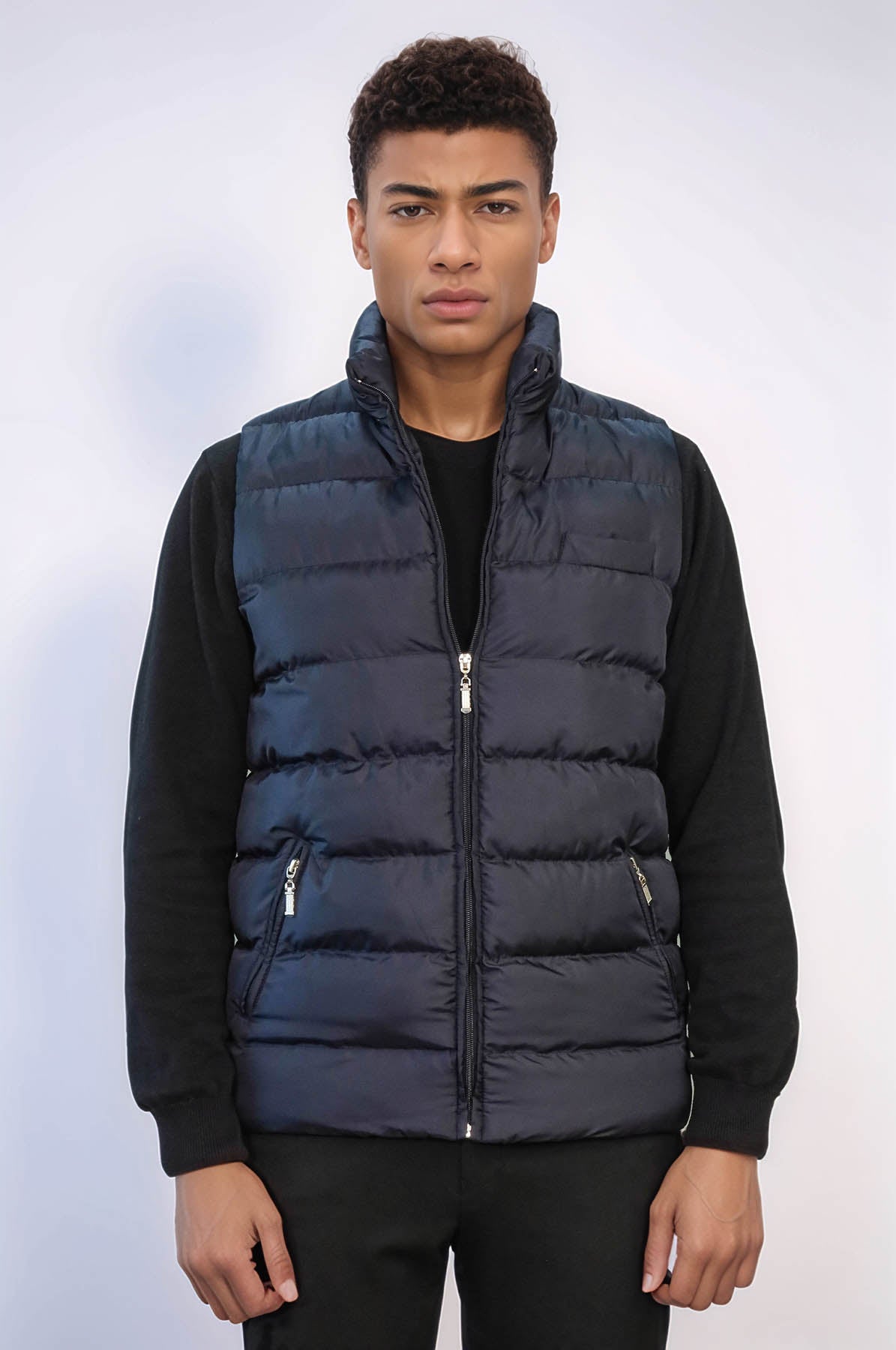 Winter vests combine comfort and elegance as one of the indispensable pieces in men's wardrobes. Available in different colors and cuts, these vests allow you to complete any outfit. The navy blue quilted stitched men's inflatable vest with zipper pocket detail is a great option for men looking for both elegance and warmth. The quilted seams offer a modern design, while the zippered pockets and stand-up collar enhance functionality. This vest brings a sporty style while keeping you warm against the cold weather. Wear a black sweater under the navy blue vest for a warm and stylish look. A pair of black or navy blue jeans will complement your sporty style. You can choose white sneakers to experience comfort and elegance together. You can add a hat and sunglasses to complete your sporty style. This outfit is a comfortable and stylish option that you can wear on many different occasions, from daily activities to sporting events.