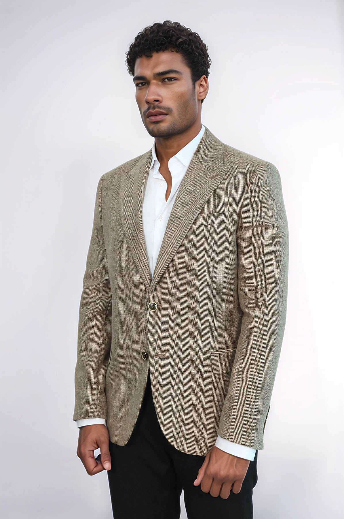 Gentlemen, say hello to your new wardrobe favorite: the cream slim-fit blazer with a wide lapel and two buttons. This patterned blazer is perfect for a variety of occasions, from business casual meetings to romantic dates and evening soirées. Looking to upgrade your style game? This cream blazer will do just that. It's the perfect blend of style and sophistication that will make you stand out in the crowd. For a business casual look, pair it with a classic white dress shirt, navy chinos, and brown leather loafers. For a romantic date, opt for a light blue shirt, dark denim jeans, and brown suede shoes. And for an evening soirée, go for a black dress shirt, black dress pants, and black leather dress shoes. Trust us, you'll be turning heads wherever you go. The slim-fit design will hug your body in all the right places, creating a modern and sleek look. Add this cream slim-fit blazer to your cart and start upgrading your look today!