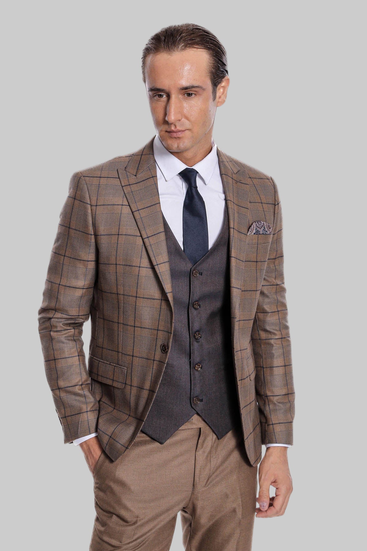 A well-tailored suit can also make you feel more confident and powerful. When you look good, you feel good, and a suit is a great way to boost your self-esteem and feel ready to take on the world. If you want to make a statement in the office or at a special event, this brown suit with a checked blazer and grey vest is a great choice. The slim fit and peak lapel give a modern and sophisticated look, while the checked pattern adds a touch of personality to the outfit. This outfit is perfect for business casual settings, team meetings, project presentations, and conferences. It will make you look confident, stylish, and ready to take on any challenge. To complete the look, pair it with a crisp white shirt and a bold tie. Choose shoes that match the color of the suit, like brown leather oxfords. For a more casual look, you can wear it with a simple t-shirt and sneakers.