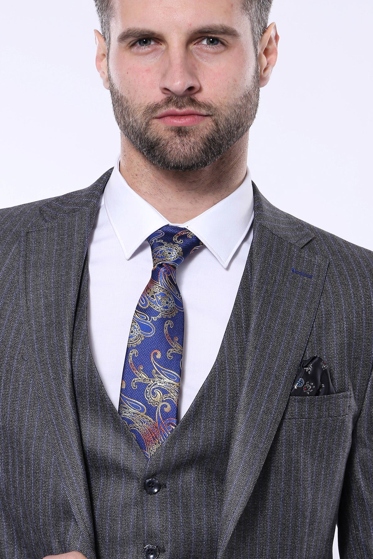 Çizgi desenli ceket, yelek ve pantolon 3 parçdan oluşan gri renk slim fit takım elbise modelidir.