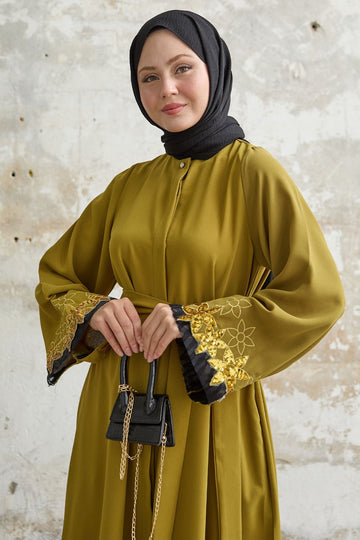 MDS Women Flower Stamp Detail Oil Green Abaya - Lompoc
