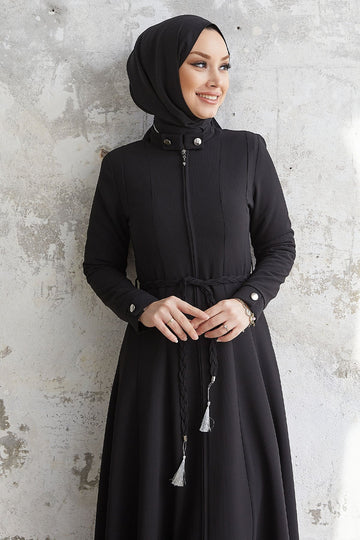 MDS Women Satin Collar Buttoned Belted Abaya - Black - Skelmersdale