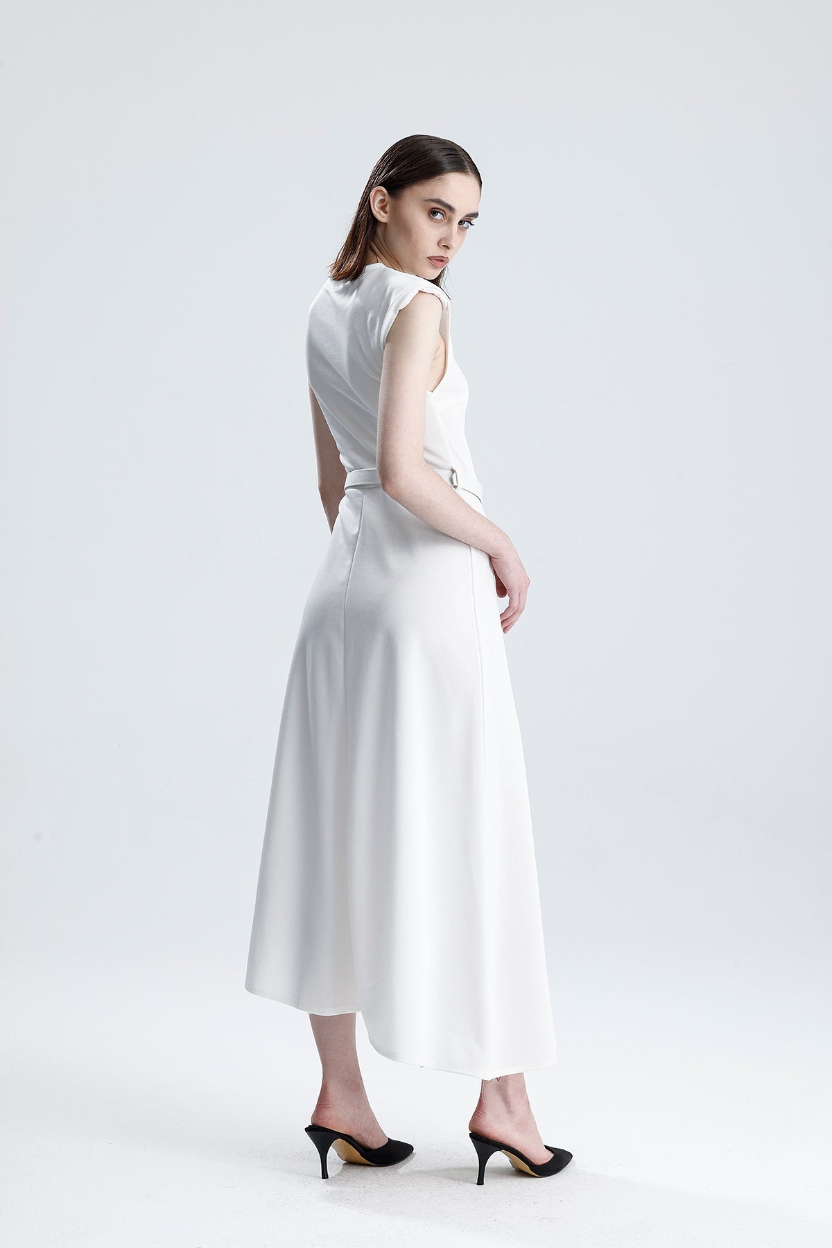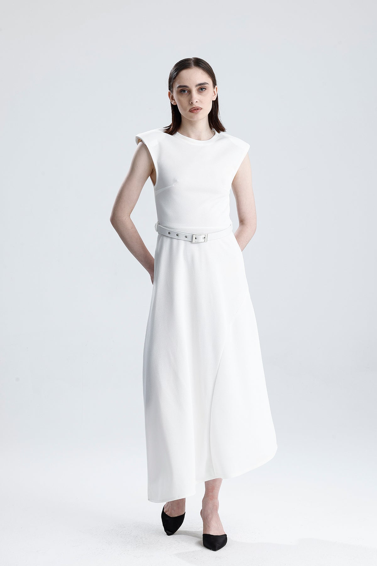 SNS Sense White Belted Sleeveless Long Dress with Shoulder Detail - Altamira