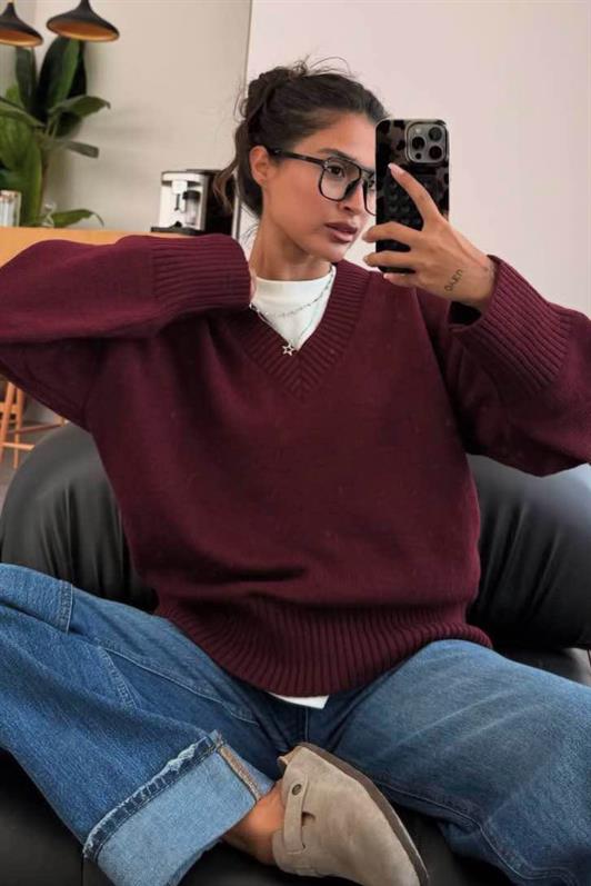 MDX Koyu Bordo V Yaka Oversize Kadın Triko Kazak MG2149 - Royal Palm Beach