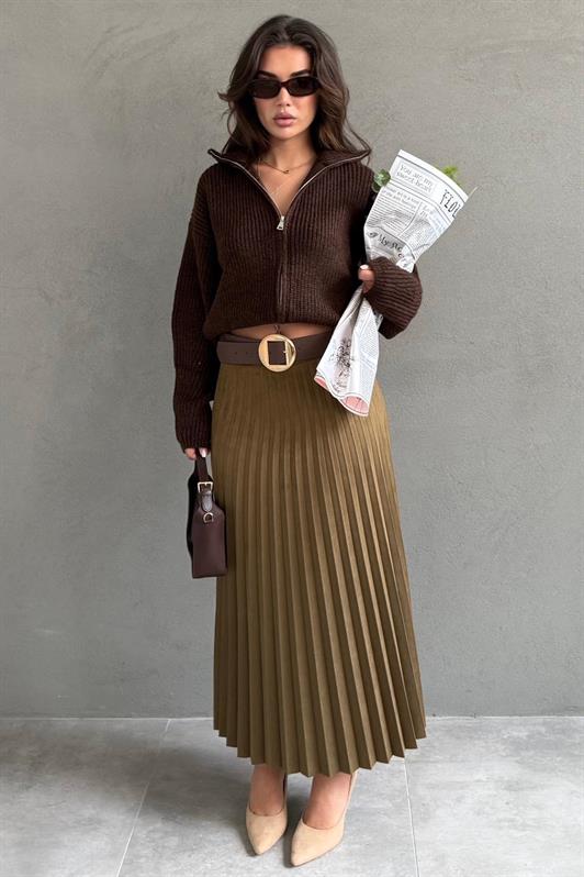 MDX Haki Pleated Belted Long Suede Women's Skirt MG2576 - Sesto Fiorentino