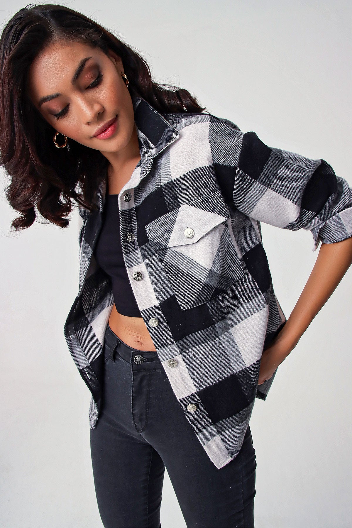 BGD Women Plaid Pattern Double Pocket Shirt - Black - Mission