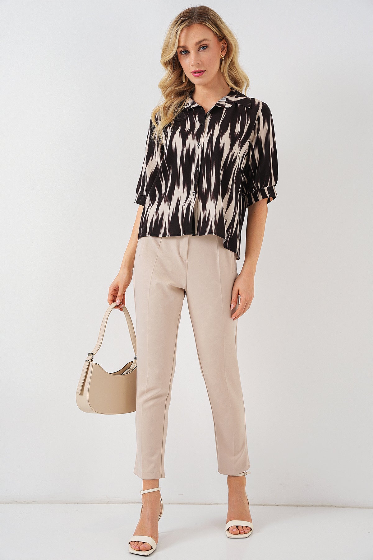 BGD Women Woman Patterned Short Sleeve Crop Top 20337 - Black - Vicenza