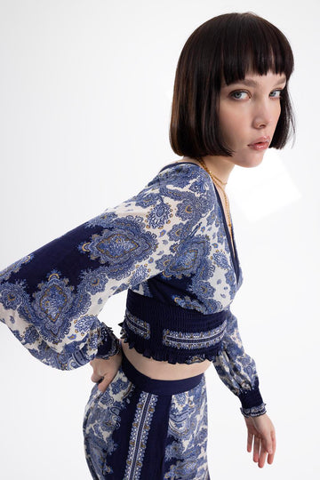 BSL Women Deep V-Neck Detailed Patterned Blouse - Catanzaro