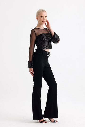 SNS Sense Black Cuff and Front-Back Sequin Sleeve and Front-Back Upper Tulle Long Sleeve Evening Blouse - Springfield