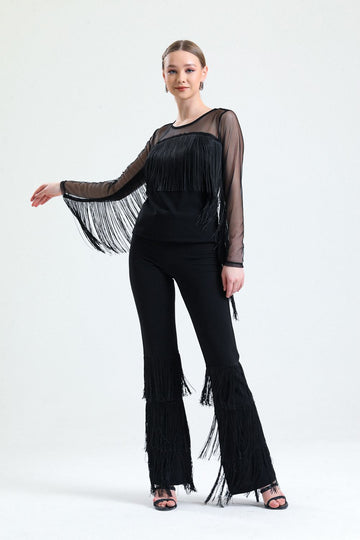 SNS Sense Black Tasseled Diver Scuba Crepe Tulle Blouse - Chilpancingo