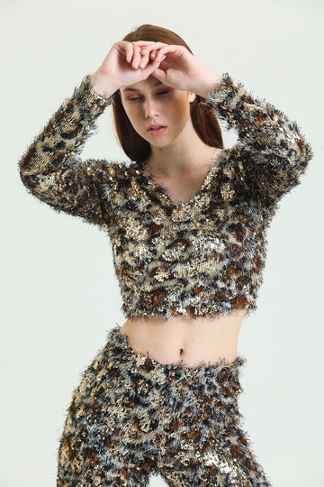 SNS Sense Gold-Coffee Bearded Sequin Evening Blouse - Como