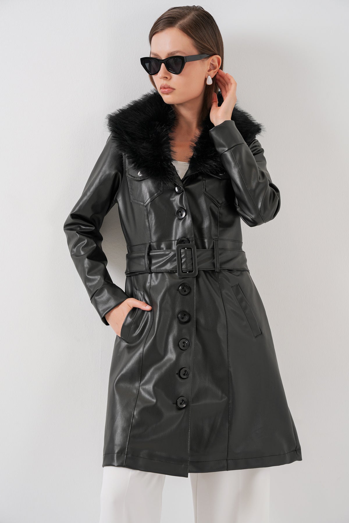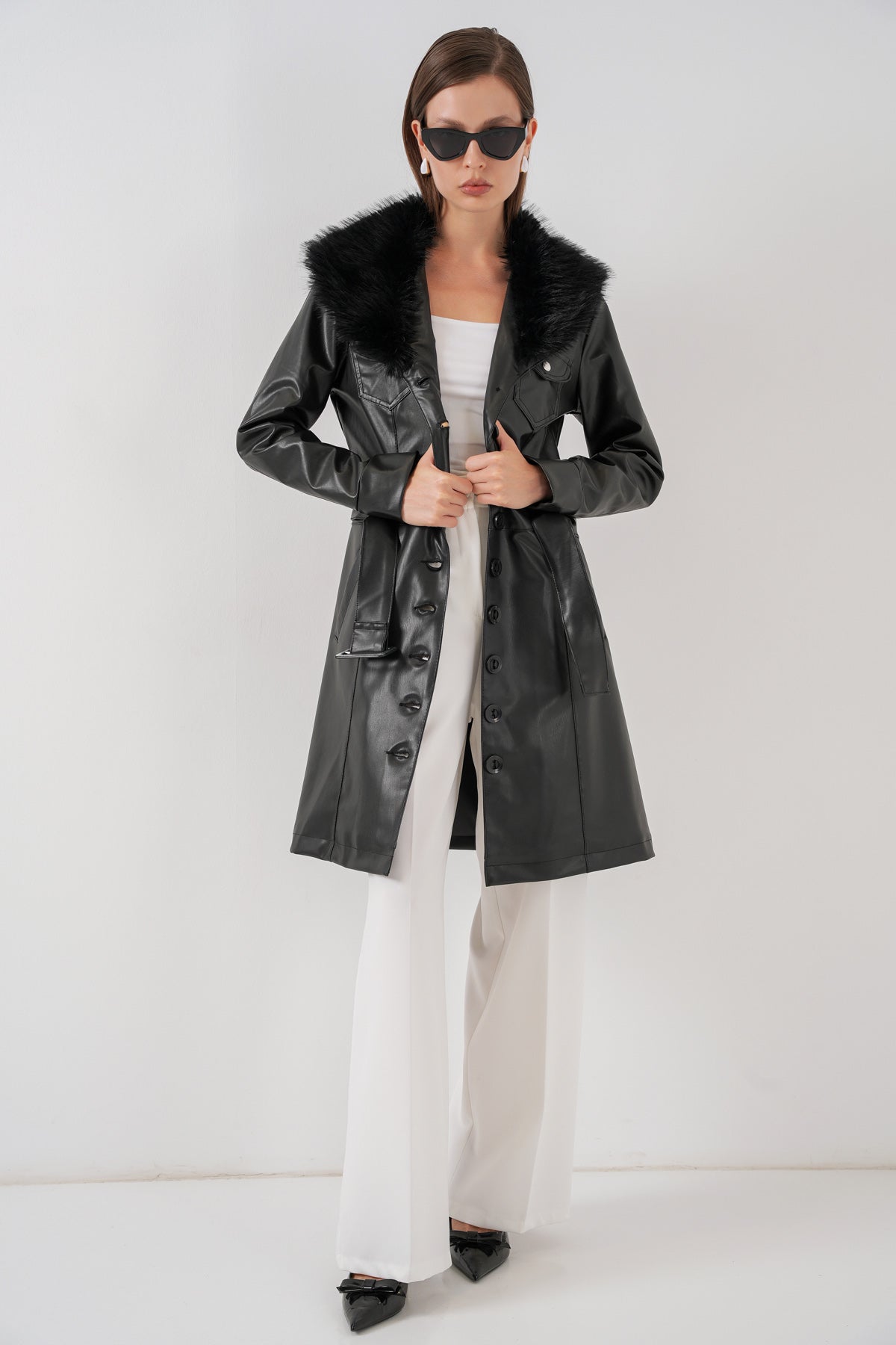 BGD Women Women's Collar Fur Leather Coat 1048 - Black - Diamond Bar