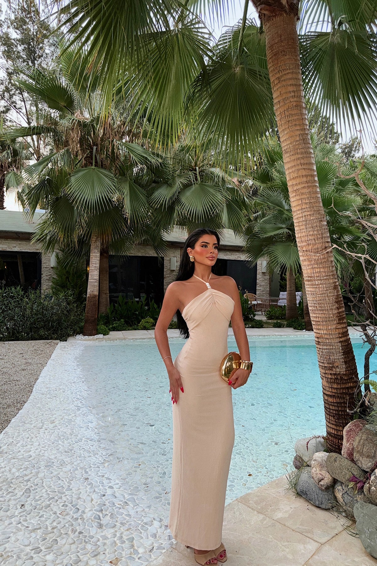 Beige Nina Pearl Detailed Tie Neck Dress Size S is used in the visual. Dress Length: 117 cm, Bust: 36 cm, Waist: 28 cm, Hips: 38 cm Model Measurements Height: 160 Weight: 50 Bust: 80 Waist: 62 Hips: 94