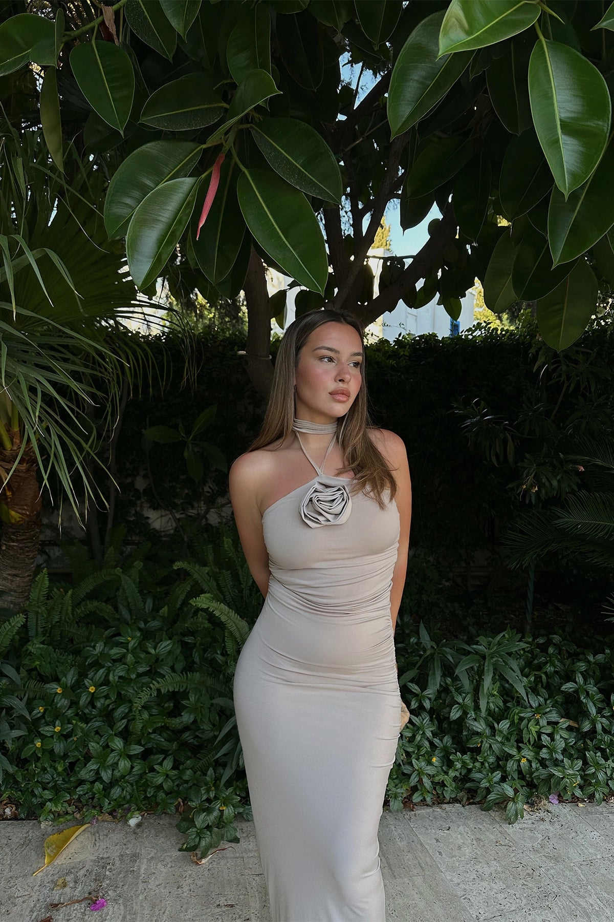 EYY Women Beige Rose Detail Tie Neck Dress - Alpharetta