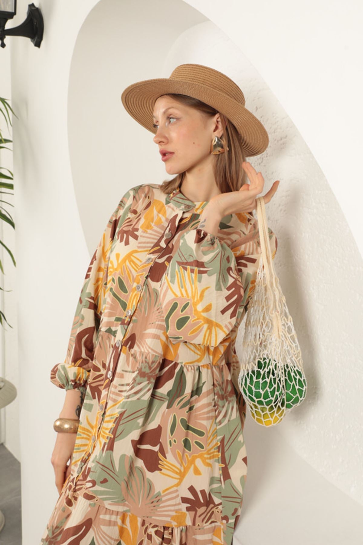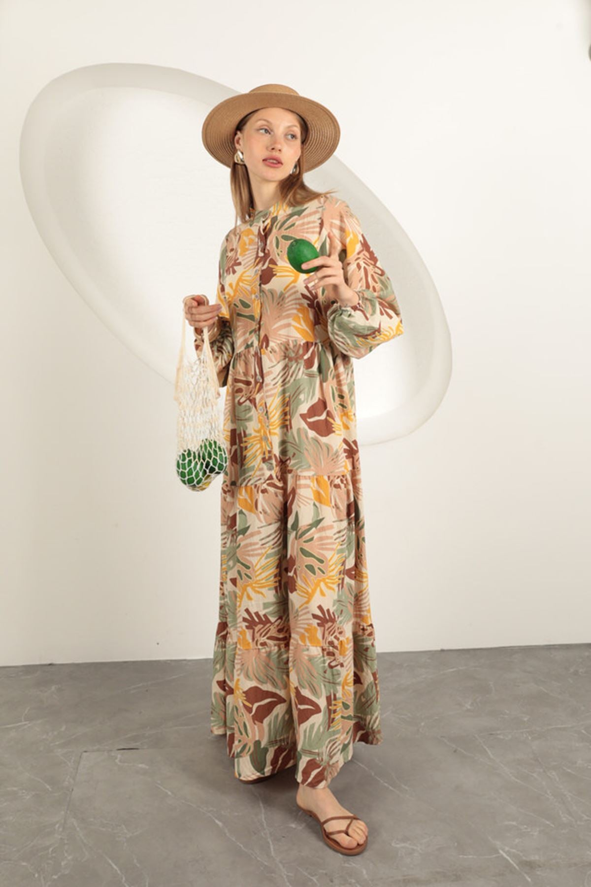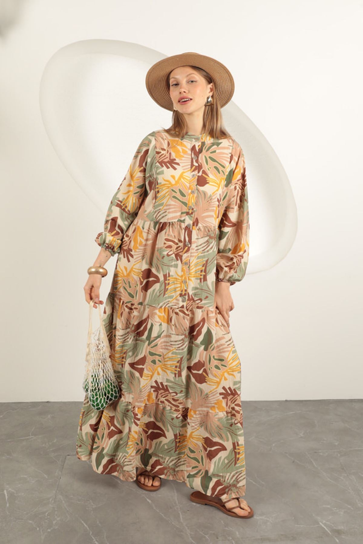 Specifications: - Color: Beige - Size: S-M-L-XL - Printing: Palm Print - Fabric: Aerobin Fabric - Types Of Sleeves: Long Sleeve - Types Of Collars / Necks : Band Neck - Length: Maxi - Fit: Straight