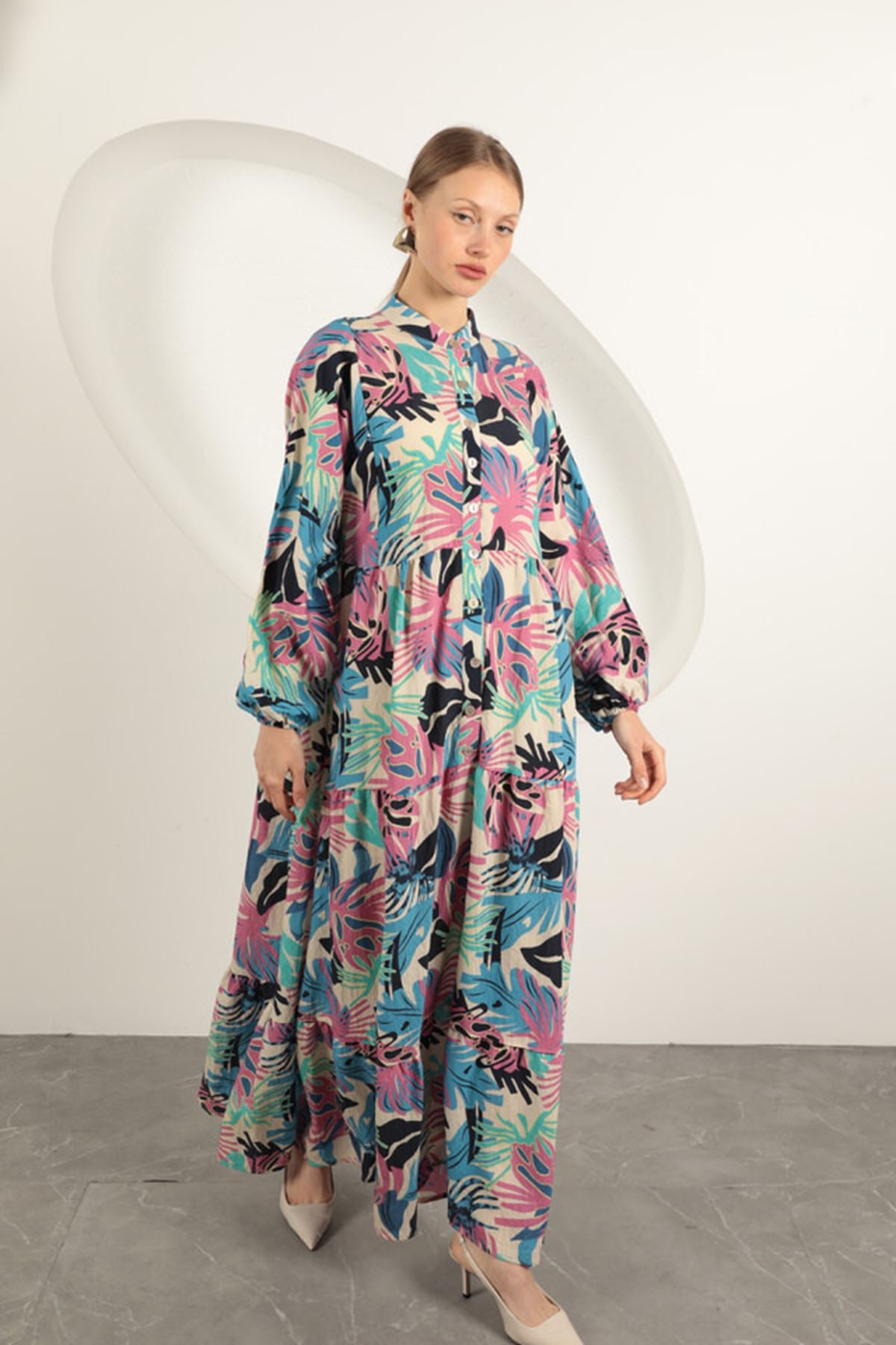 Specifications: - Color: Blue - Size: S-M-L-XL - Printing: Palm Print - Fabric: Aerobin Fabric - Types Of Sleeves: Long Sleeve - Types Of Collars / Necks : Band Neck - Length: Maxi - Fit: Straight
