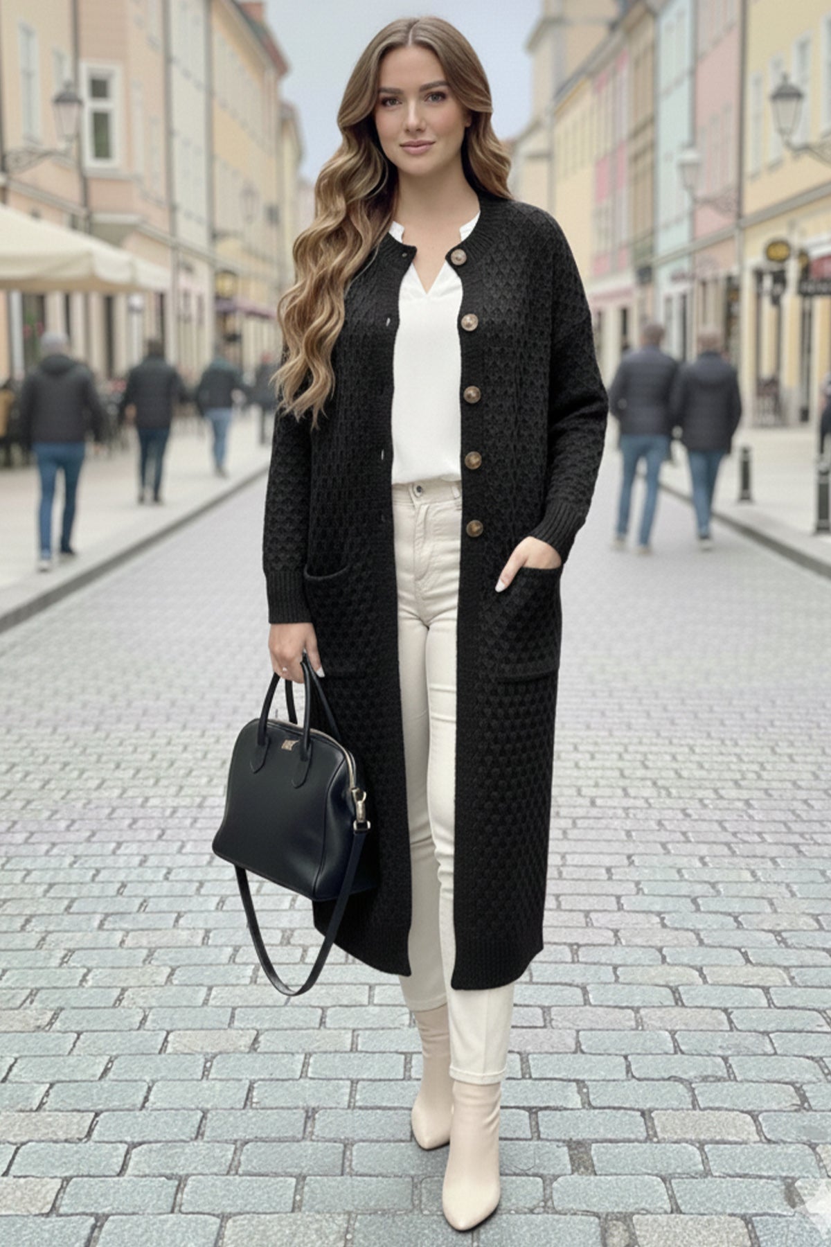 BNG Women Cepli Desenli Uzun Triko Hırka R4278 Siyah - Holyoke