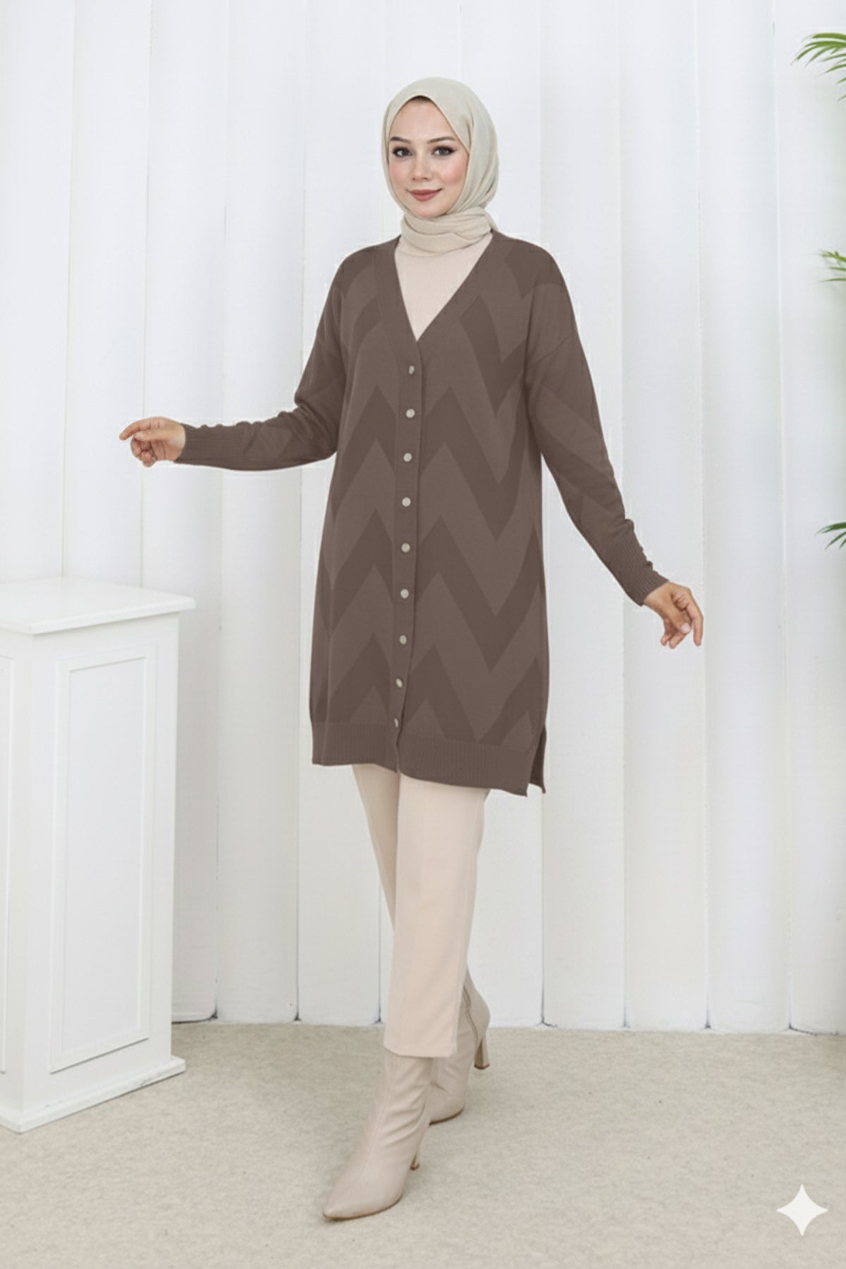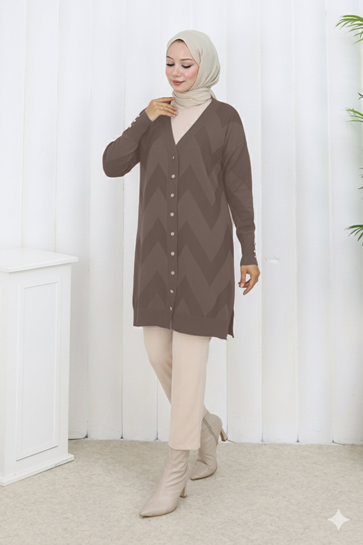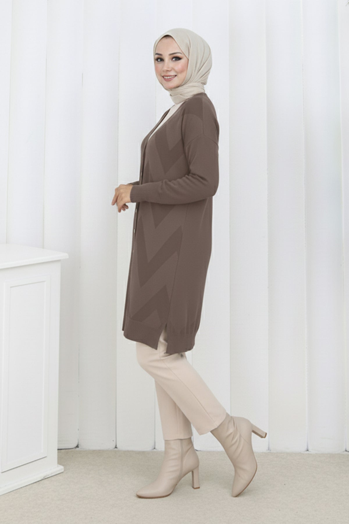 BNG Women Desenli Uzun Merserize Hırka N3193 Vizon - Port Arthur