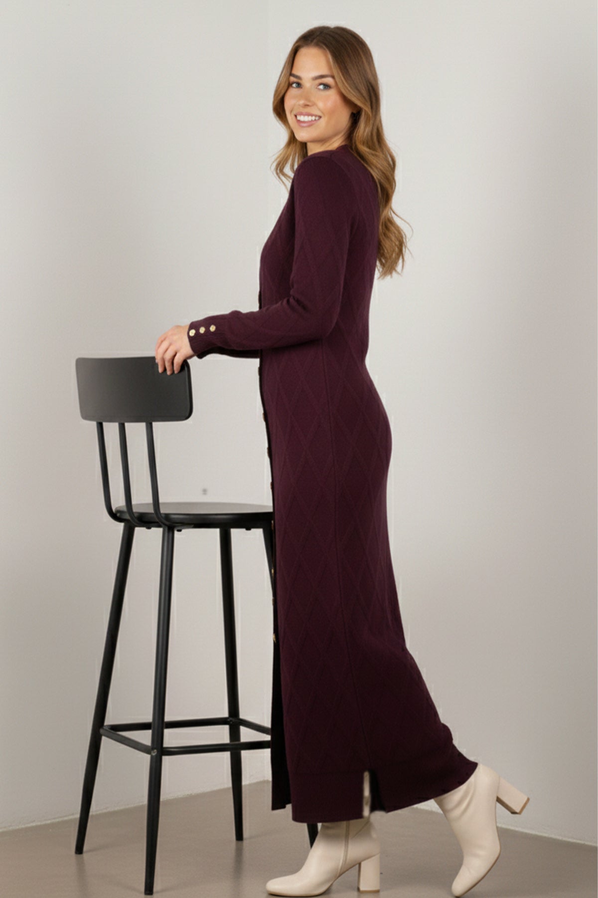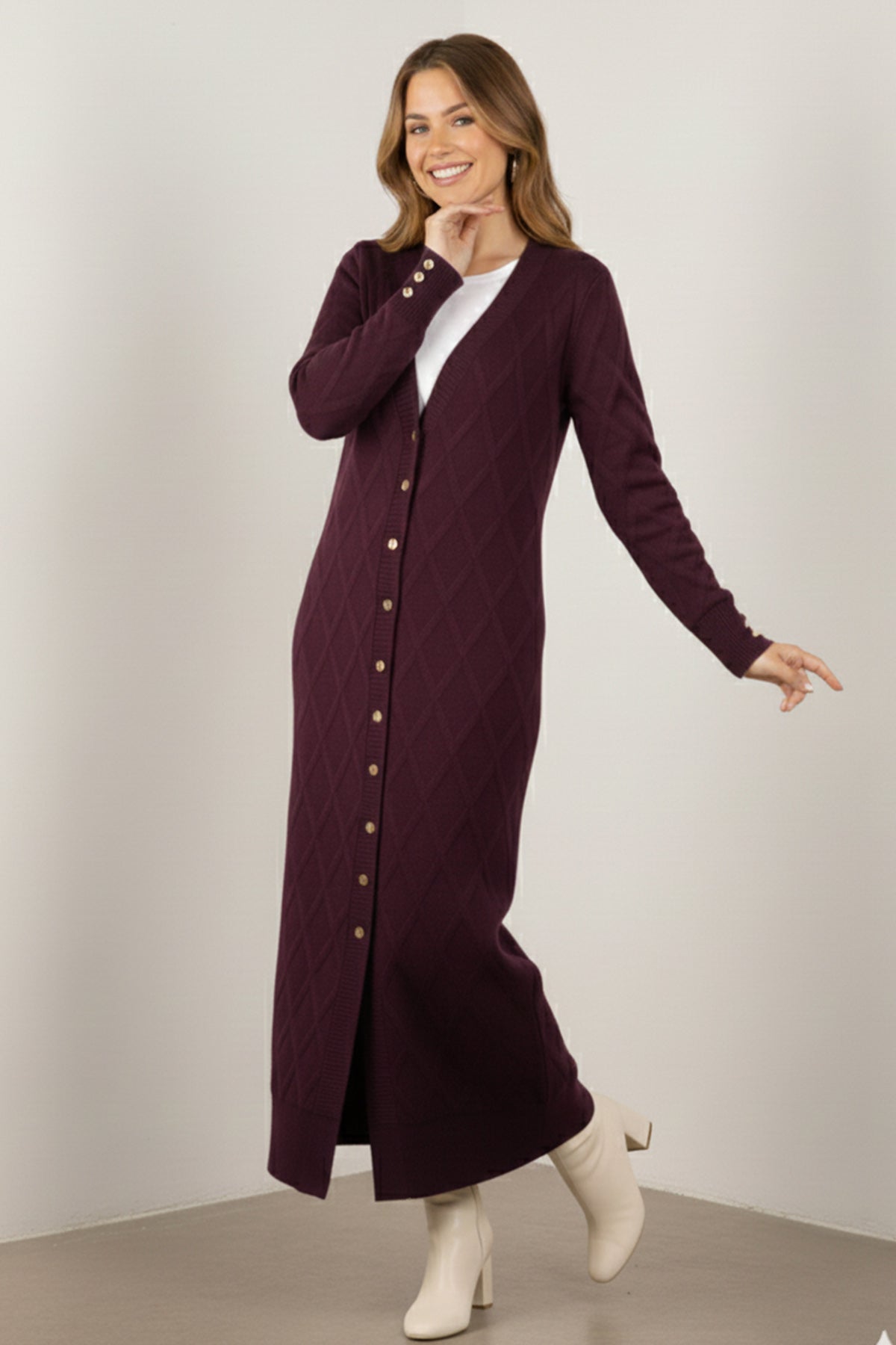 BNG Women Desenli Uzun Merserize Hırka N3295 Mürdüm - Denver