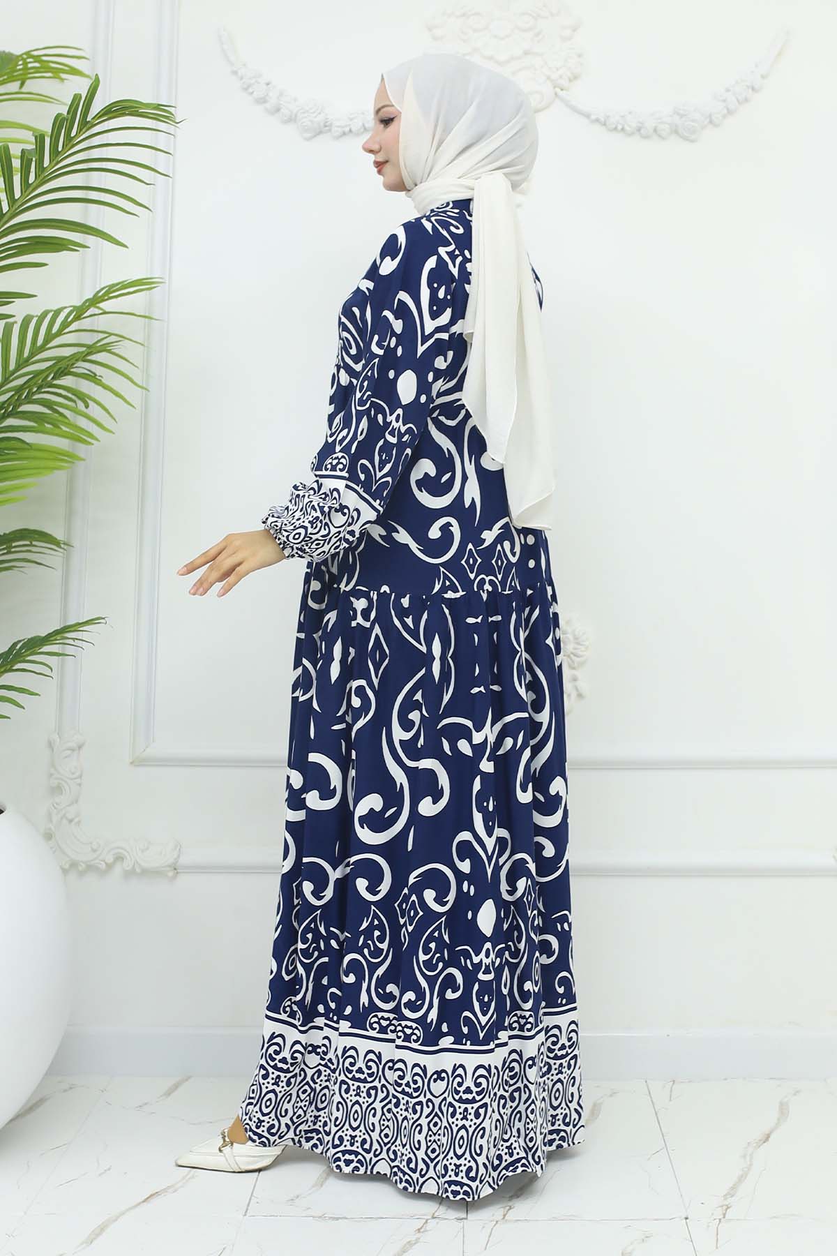 BNG Women Desenli Viskon Elbise Lacivert 2425 - Mountain View
