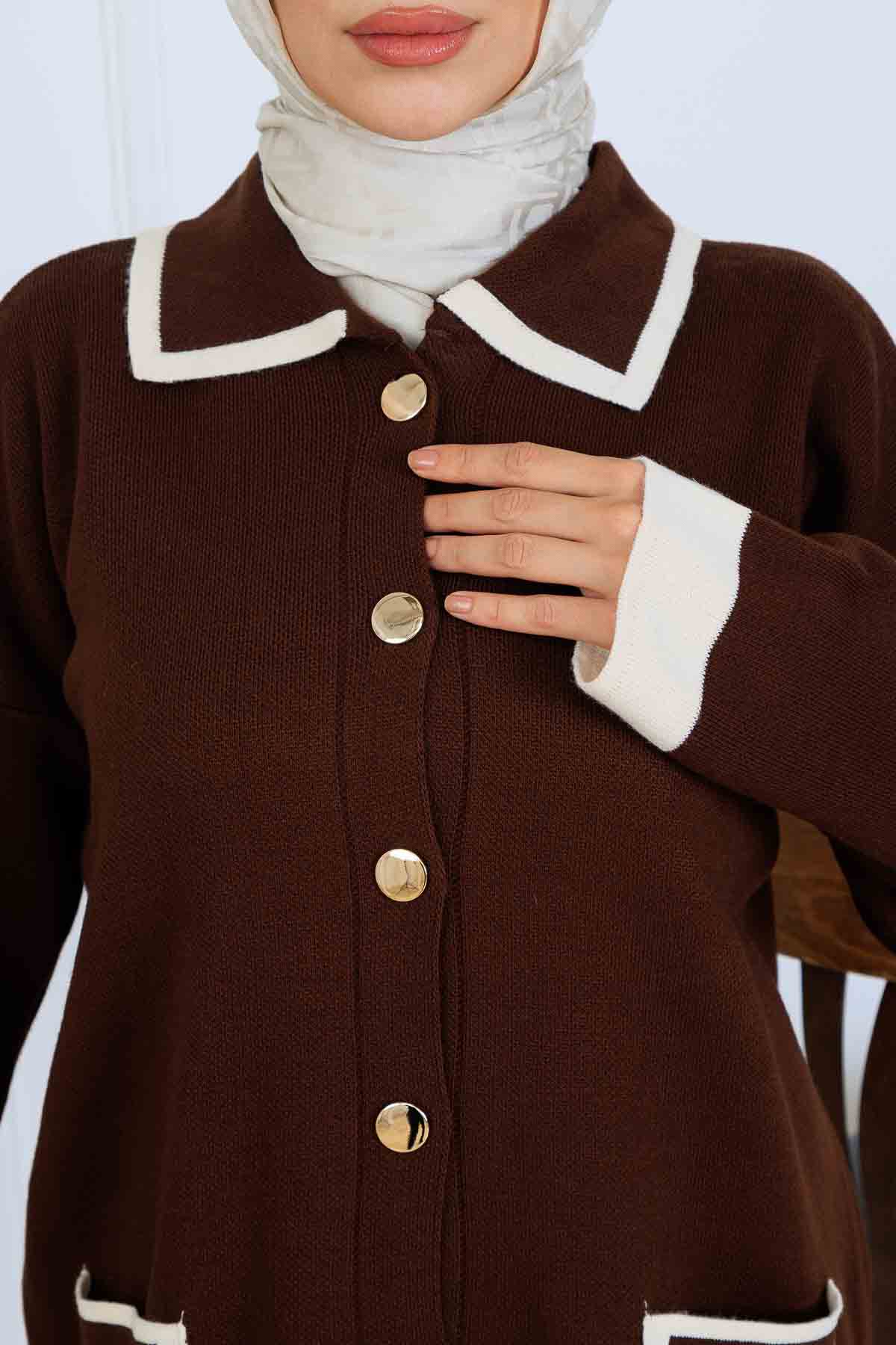 BNG Women Düğmeli Çizgi Detaylı Triko Takım S1043 Kahverengi - Villajoyosa