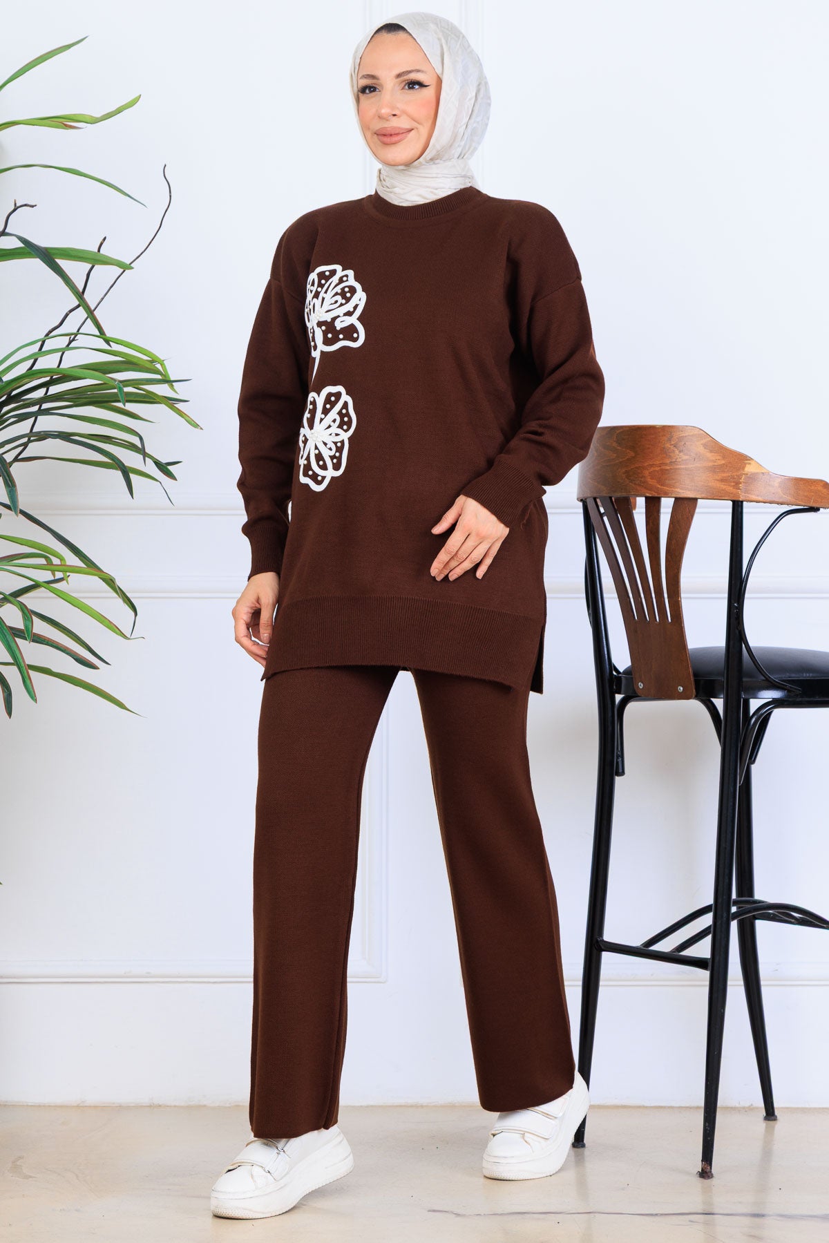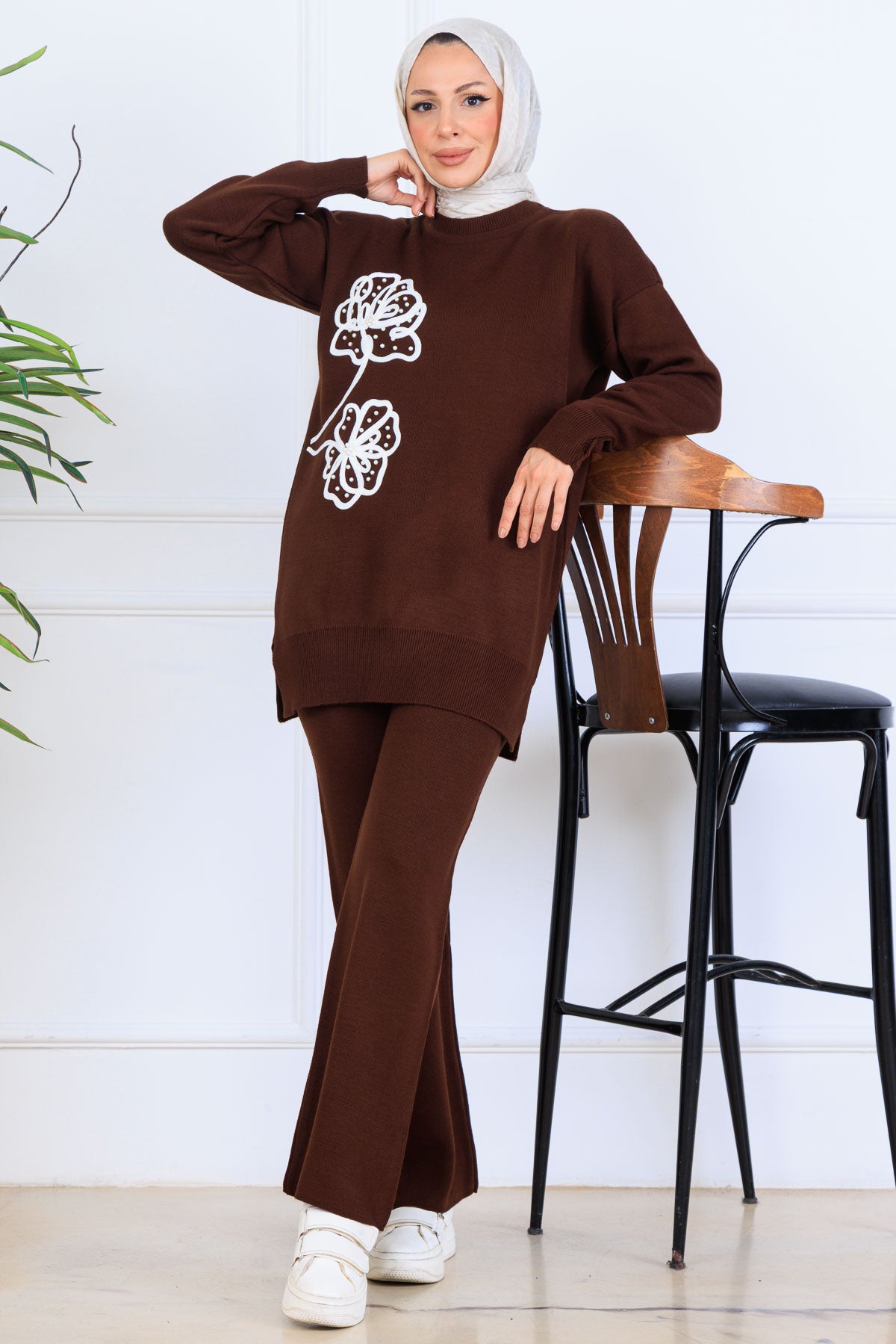BNG Women Embroidered Detailed Knit Set S1120 Brown - Reşiţa