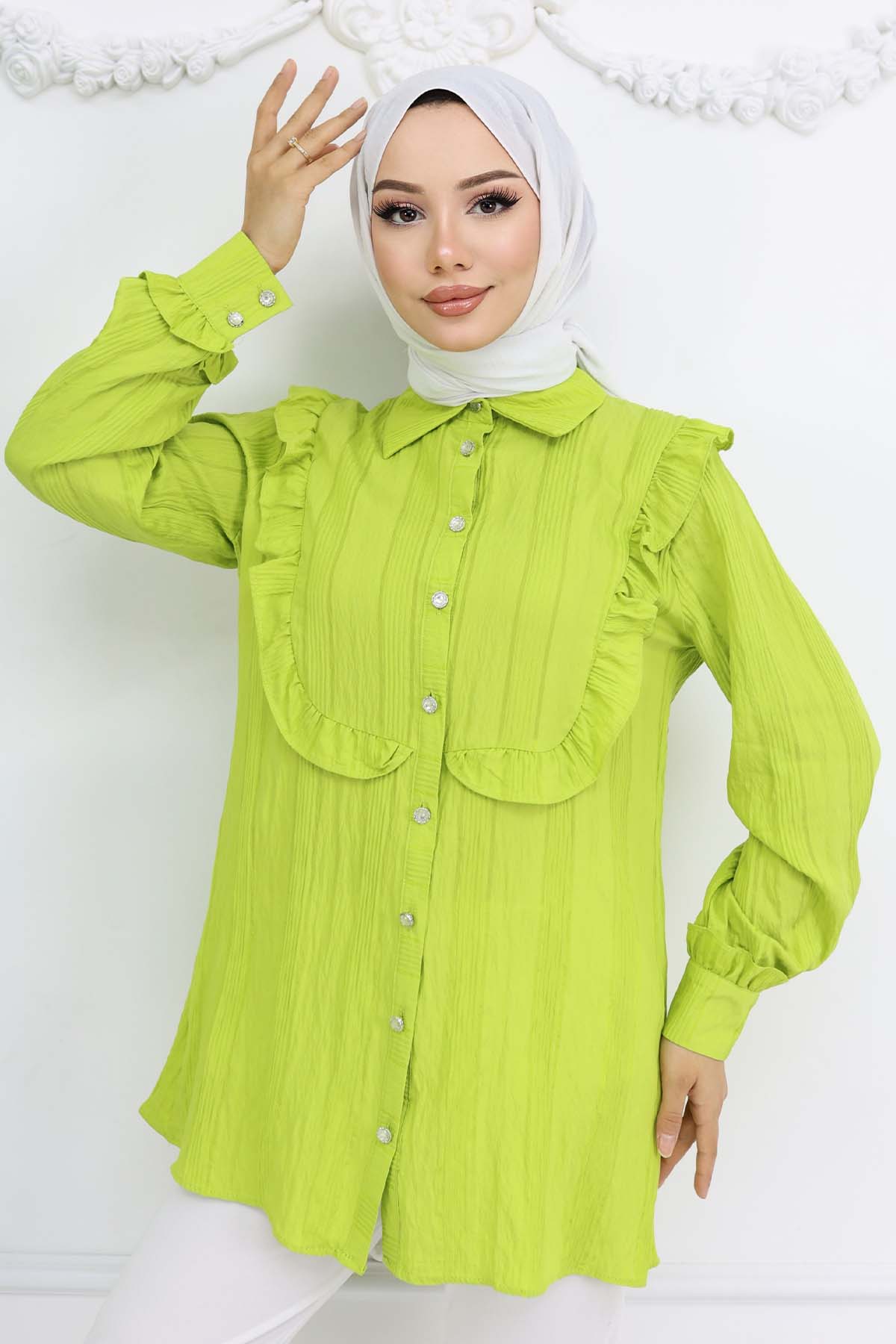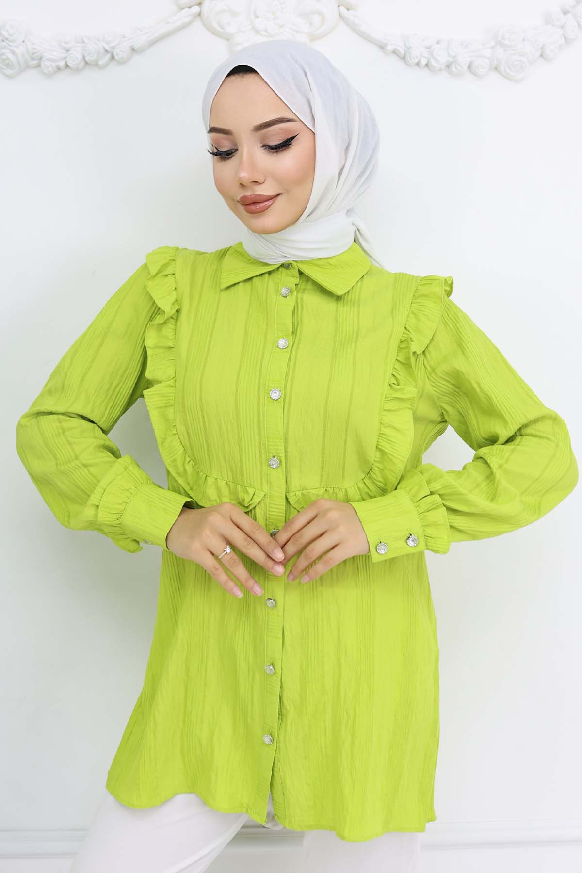 BNG Women Fırfır Detaylı Kendinden Desenli Gömlek Fıstık Yeşili 2235 - Ponce
