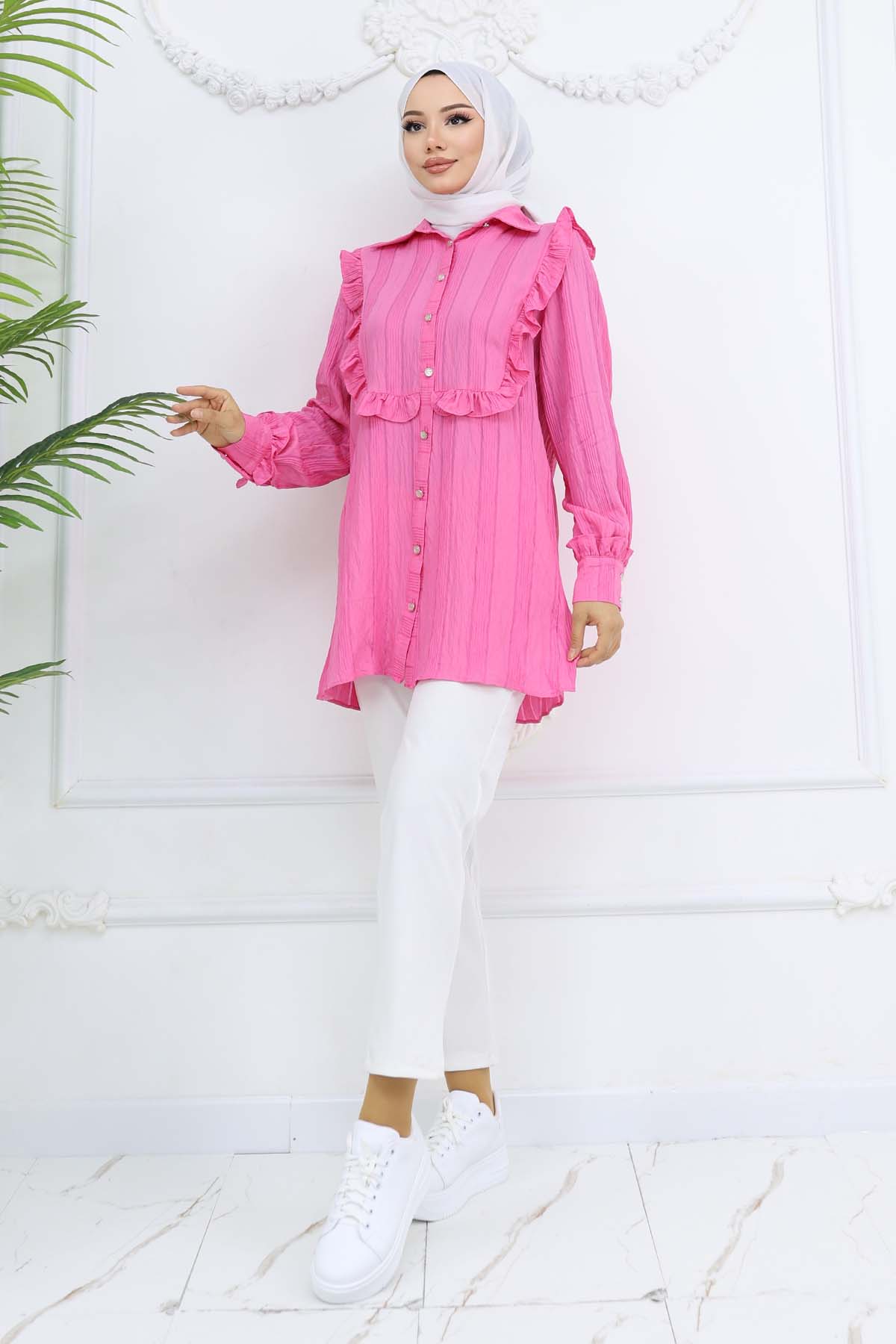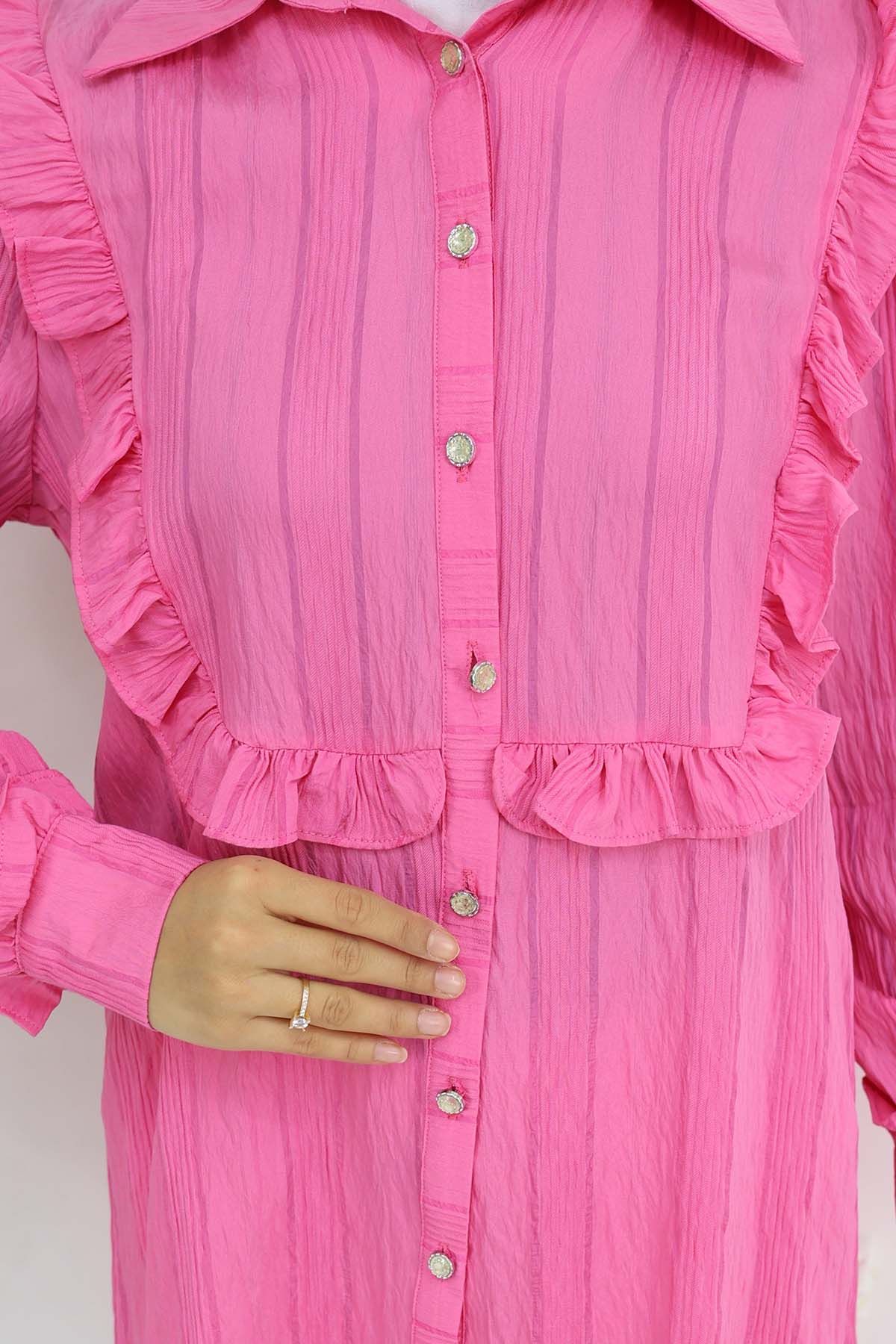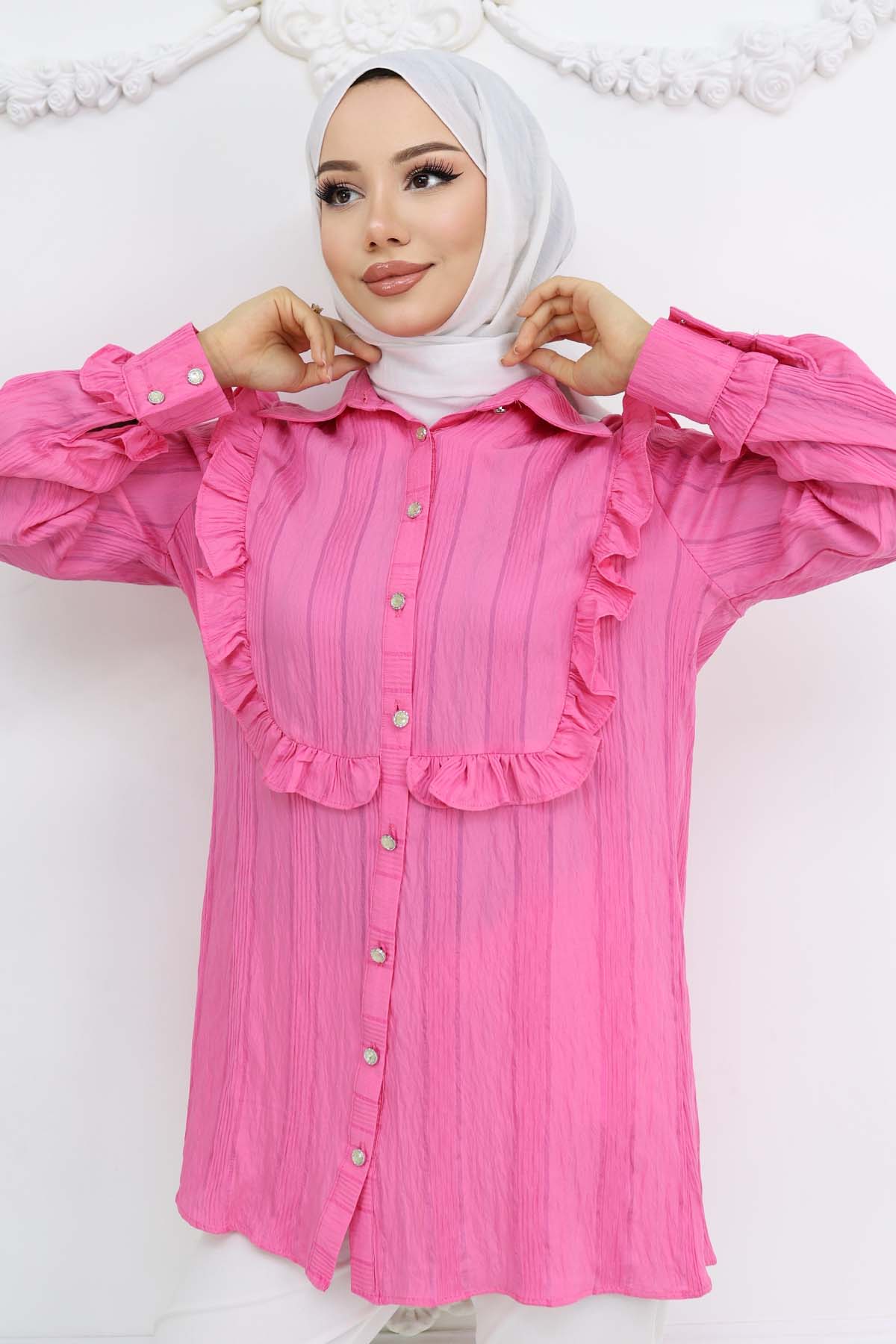 BNG Women Fırfır Detaylı Kendinden Desenli Gömlek Fuşya 2235 - Walkden