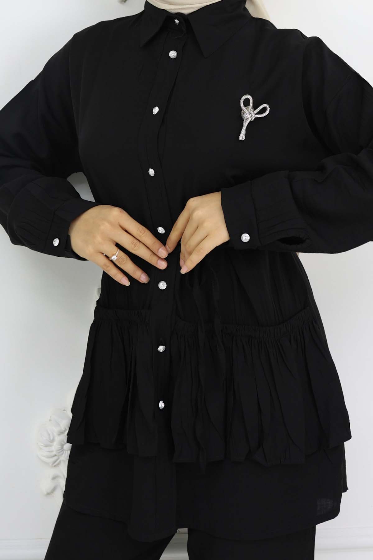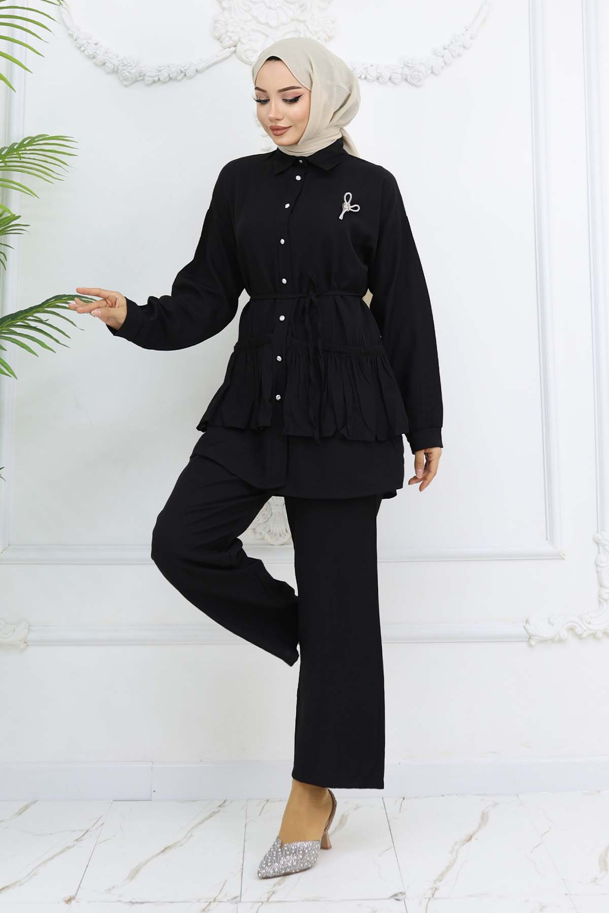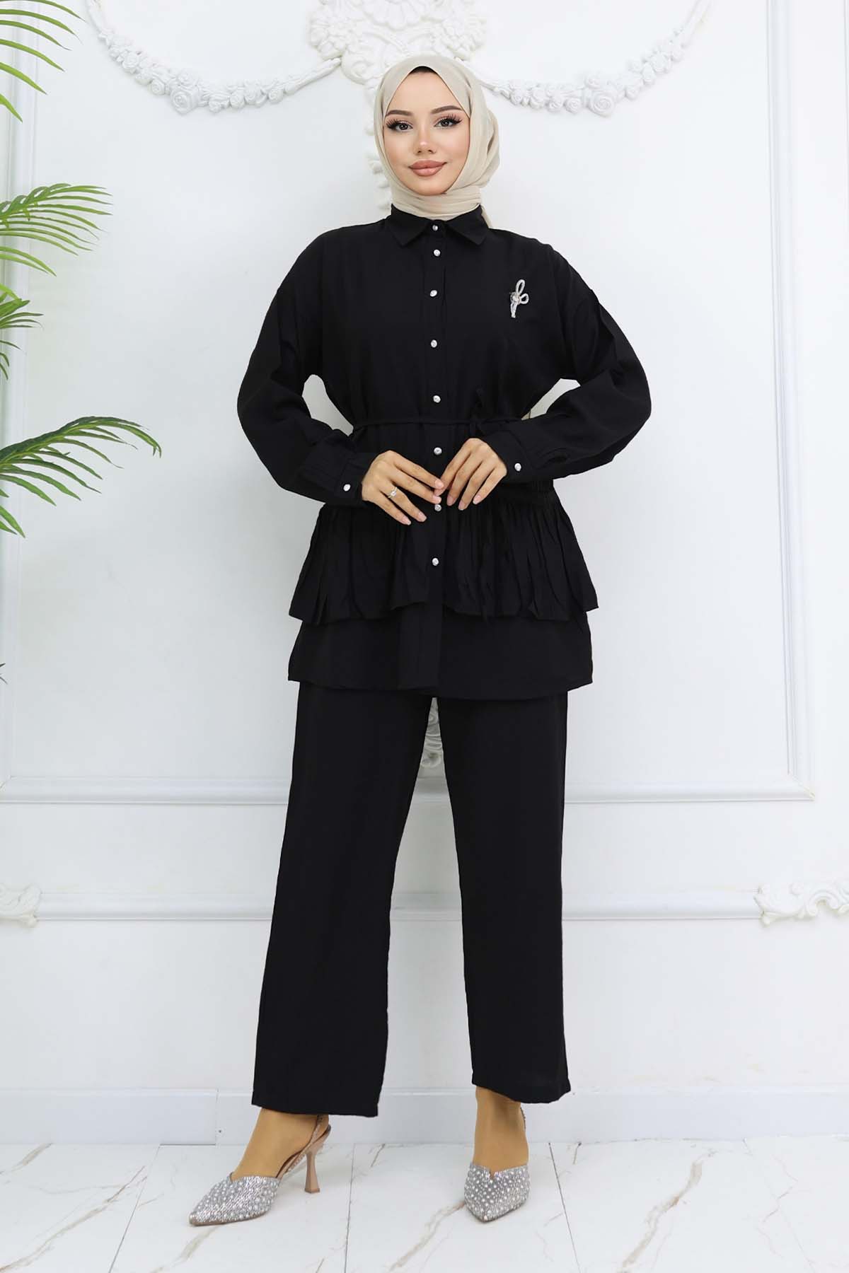 BNG Women Fırfırlı Broş Detaylı İkili Takım Siyah 4793 - Myrnohrad