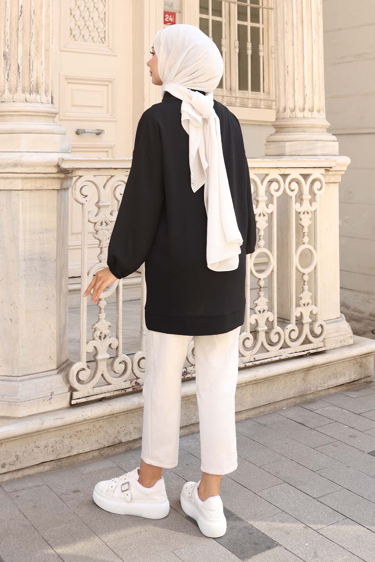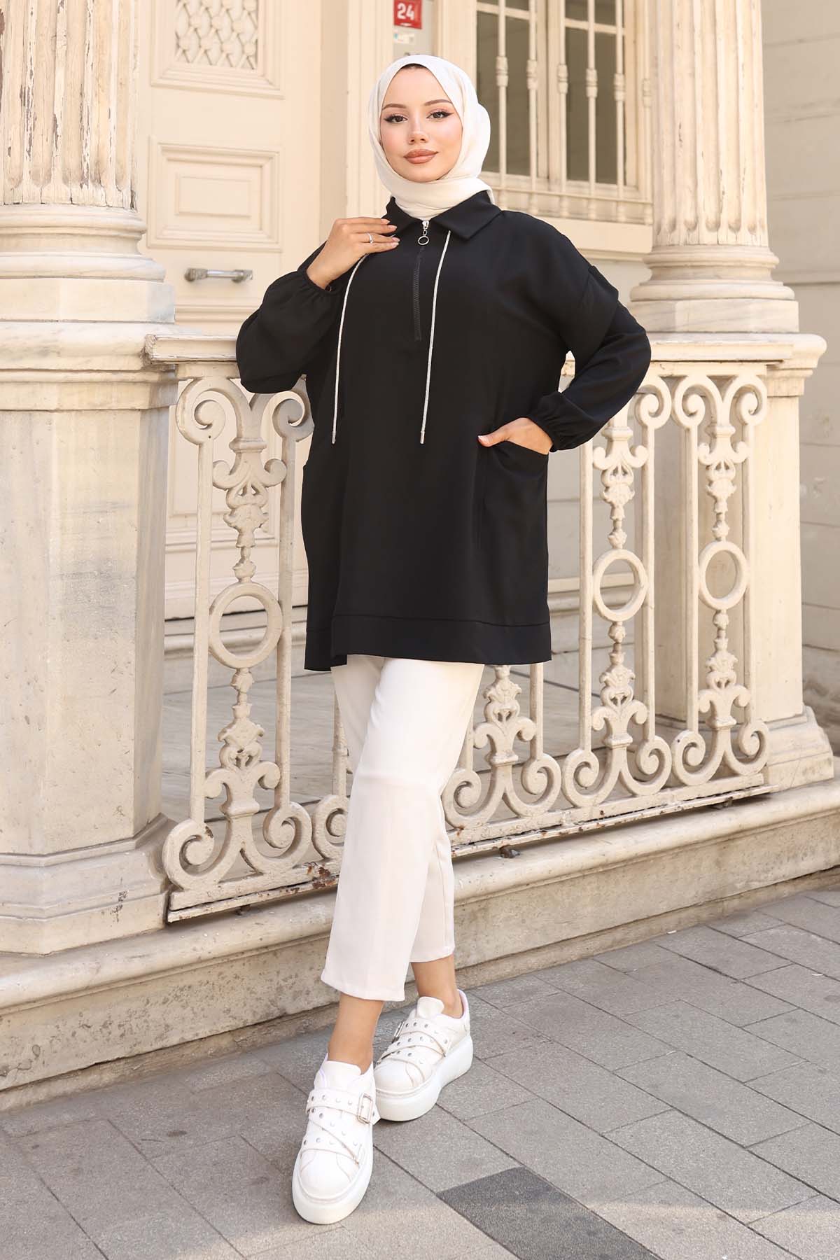 BNG Women İp Detaylı Yarım Fermuarlı Tesettür Tunik Siyah 3190 - Fuenlabrada