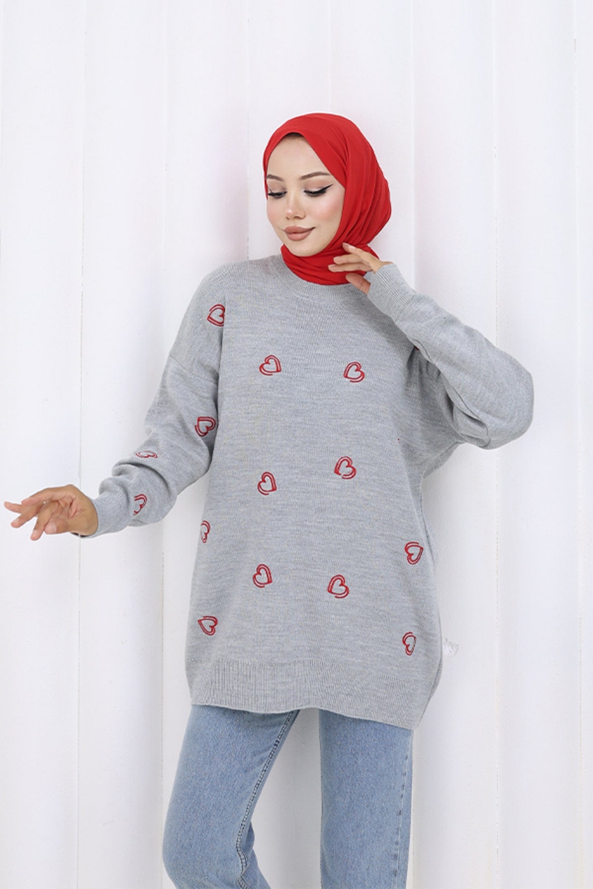 BNG Women Kalp Nakışlı Triko Kazak N3254 Gri - Pinto