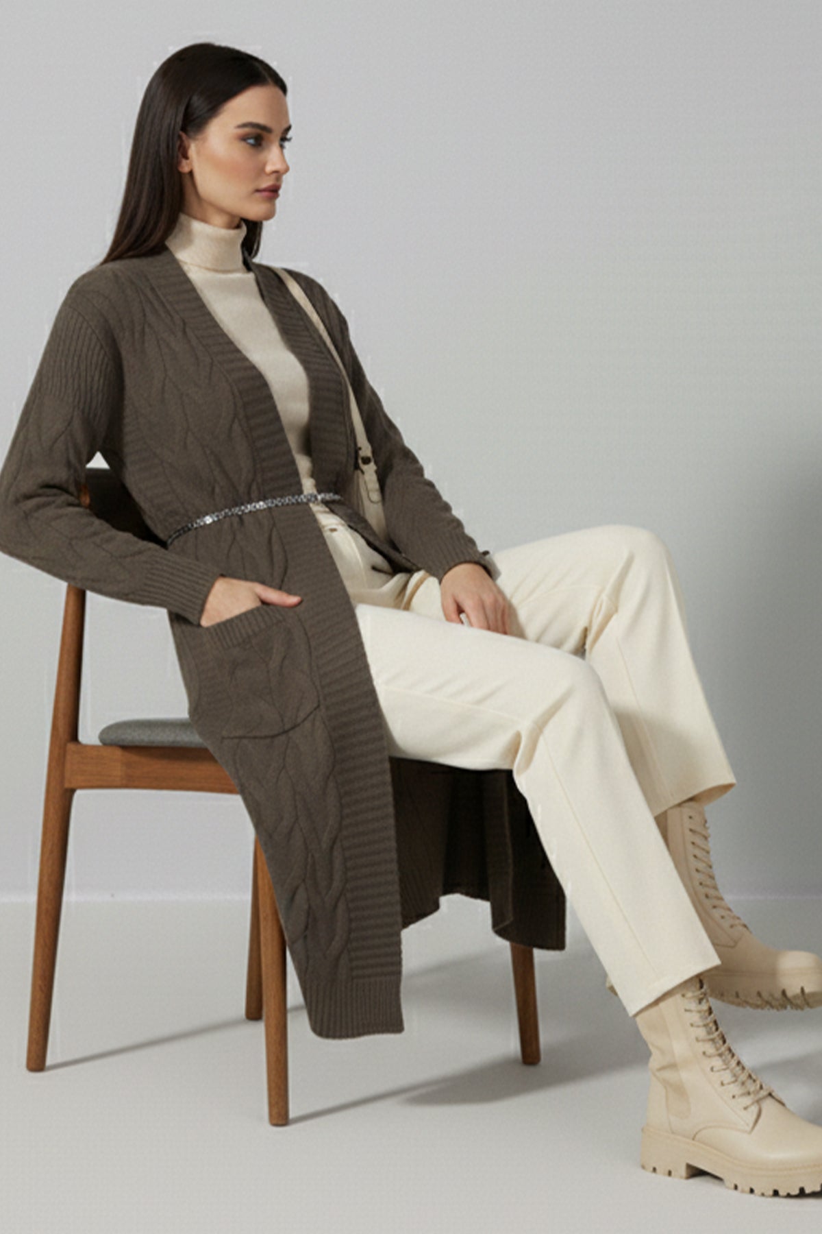 Product Information: Cardigan length: 106 cm, Chest: 114 cm. Fabric type: 70% Acrylic, 30% Wool. Model Measurements: Height: 168 cm, Chest: 83 cm, Waist: 68 cm, Hips: 90 cm. The product on the model: Standard Size. Fits sizes 36-44. There may be a color difference due to concept shootings in the product color.