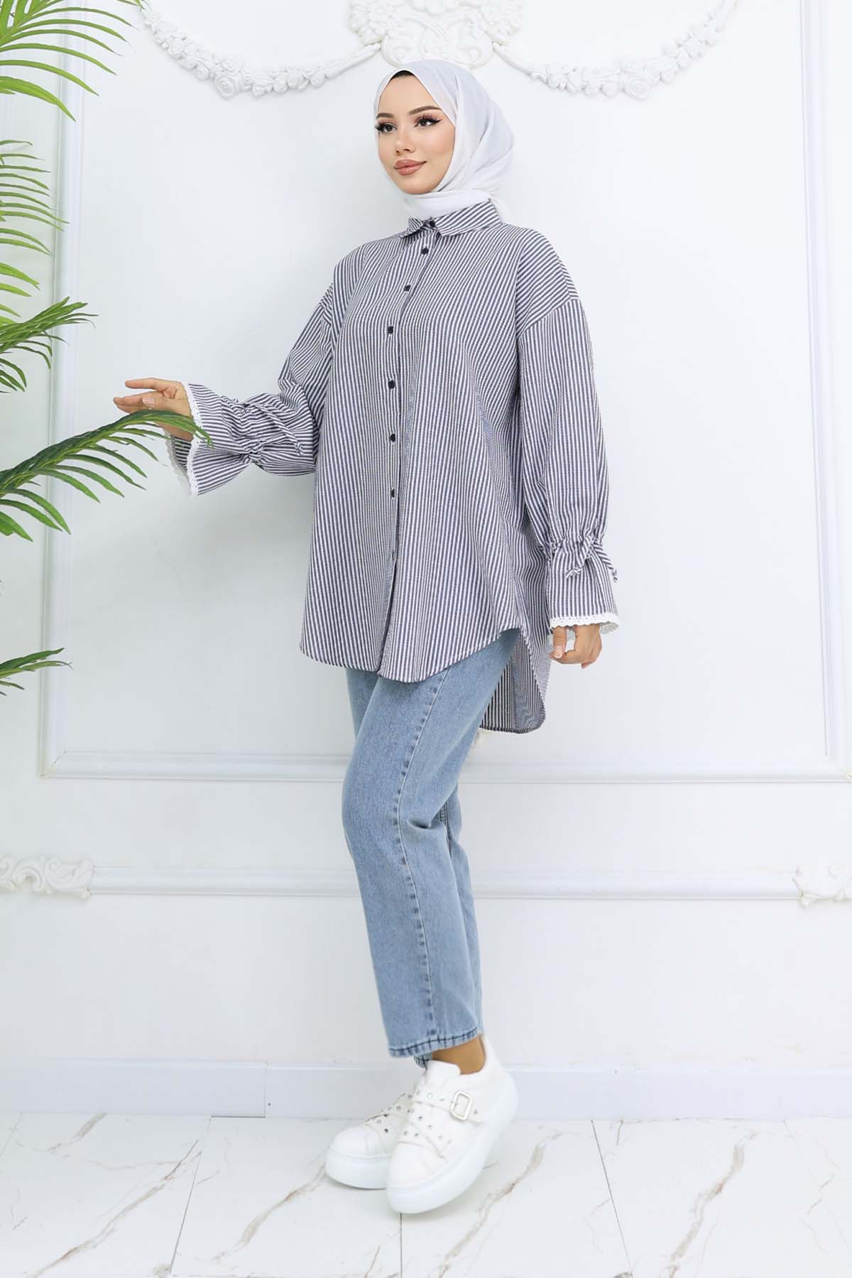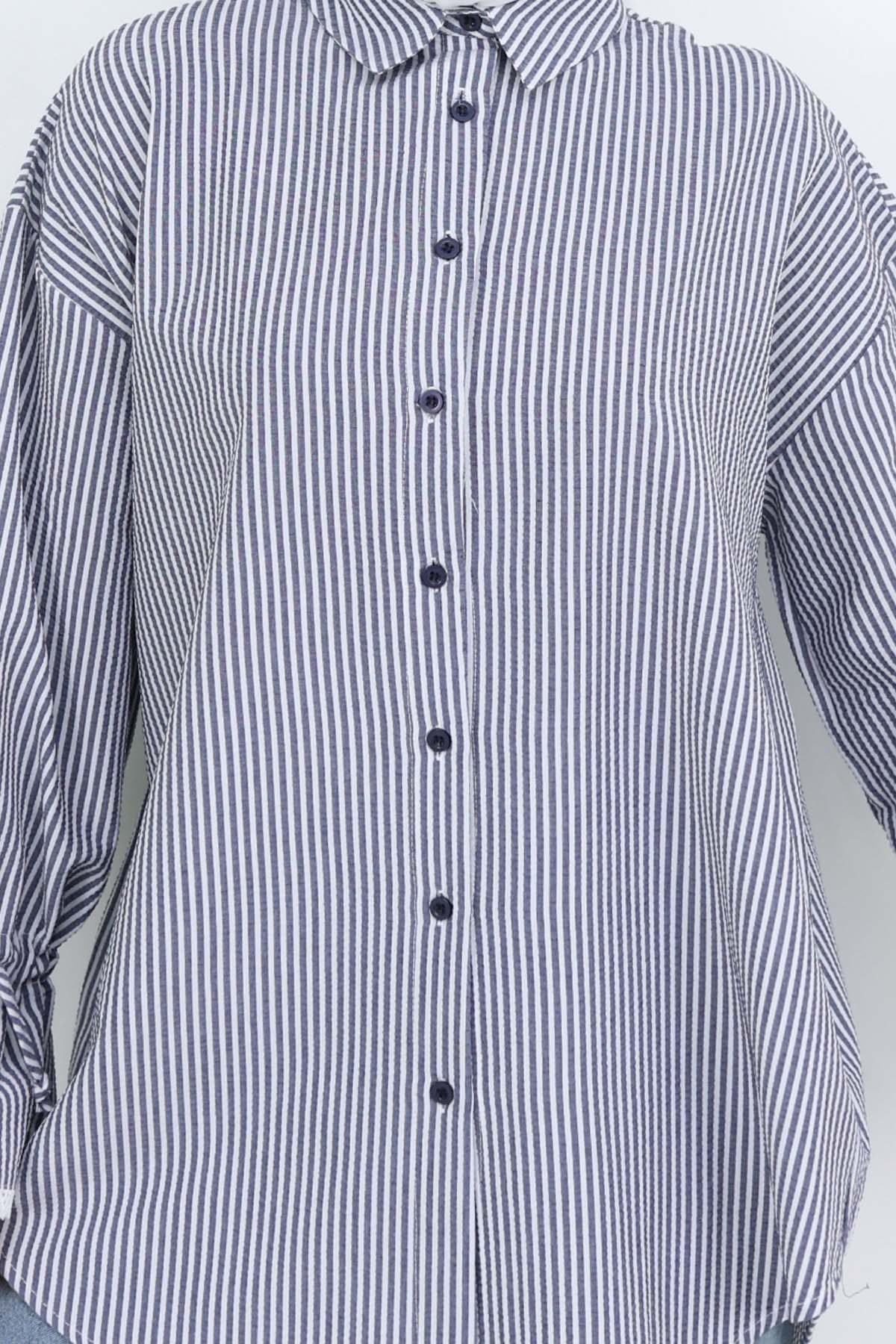 BNG Women Kolları Fisto Detaylı Çizgili Gömlek Lacivert 2226 - DeSoto