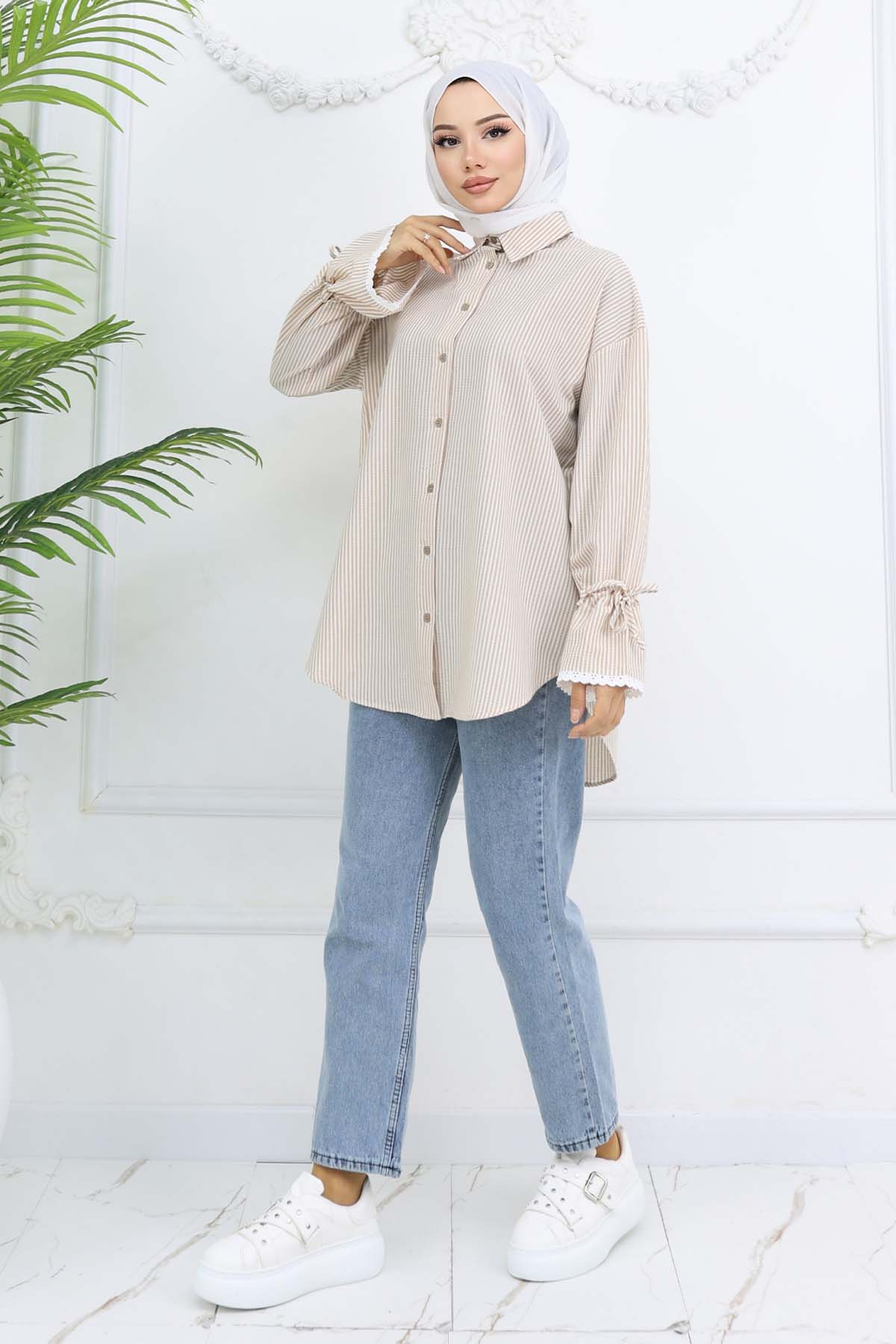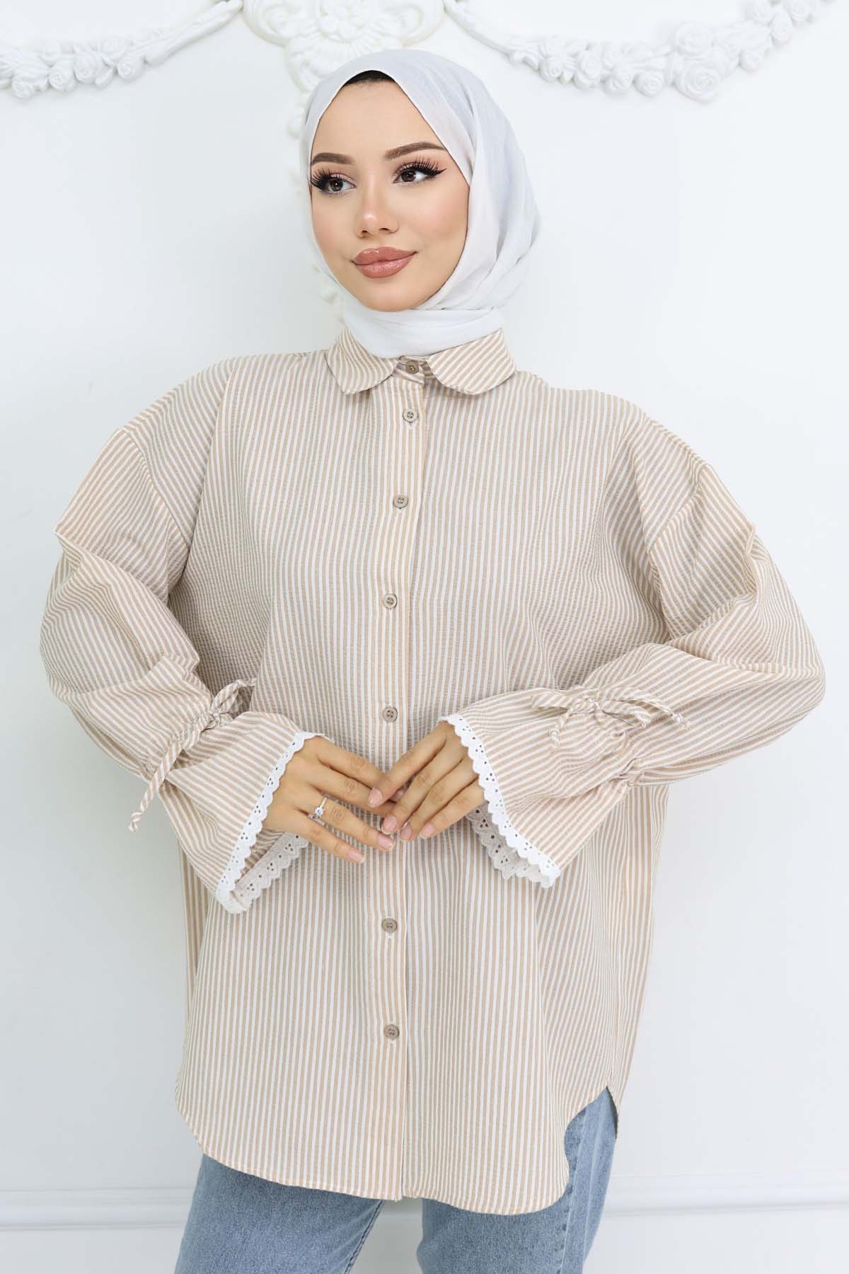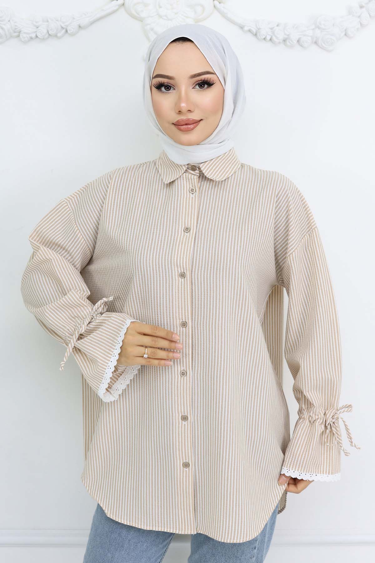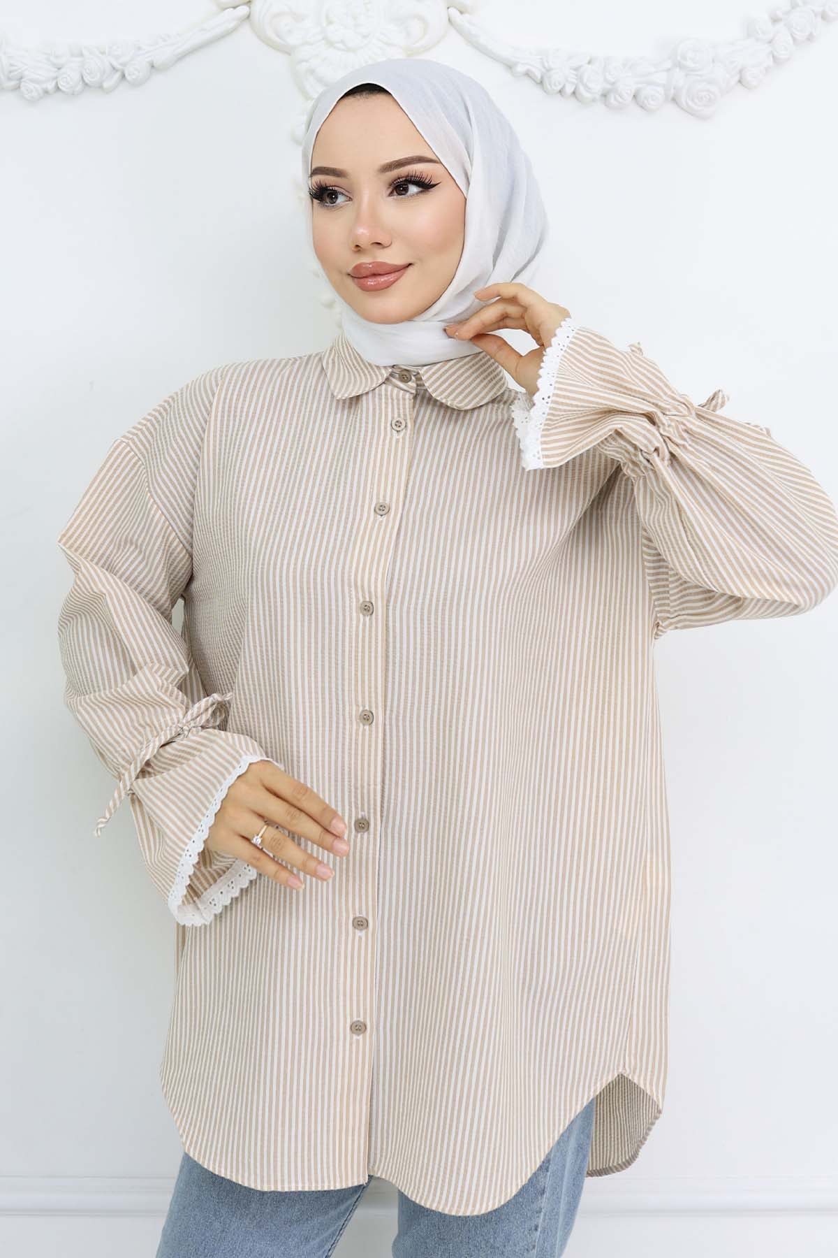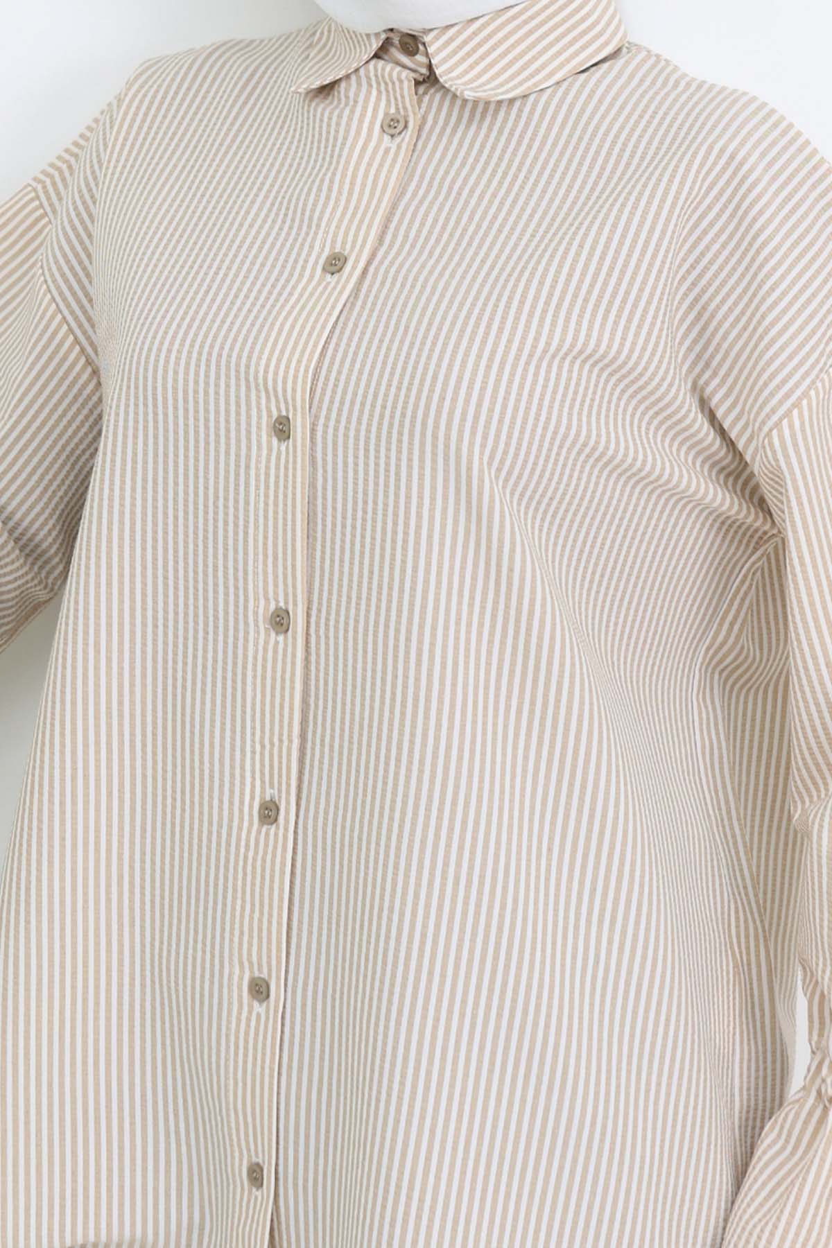 BNG Women Kolları Fisto Detaylı Çizgili Gömlek Vizon 2226 - DeLand