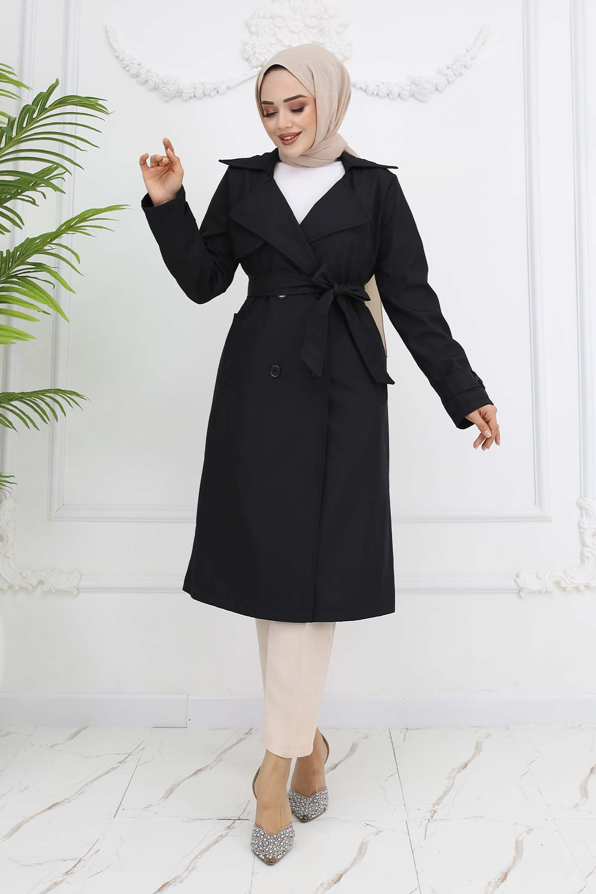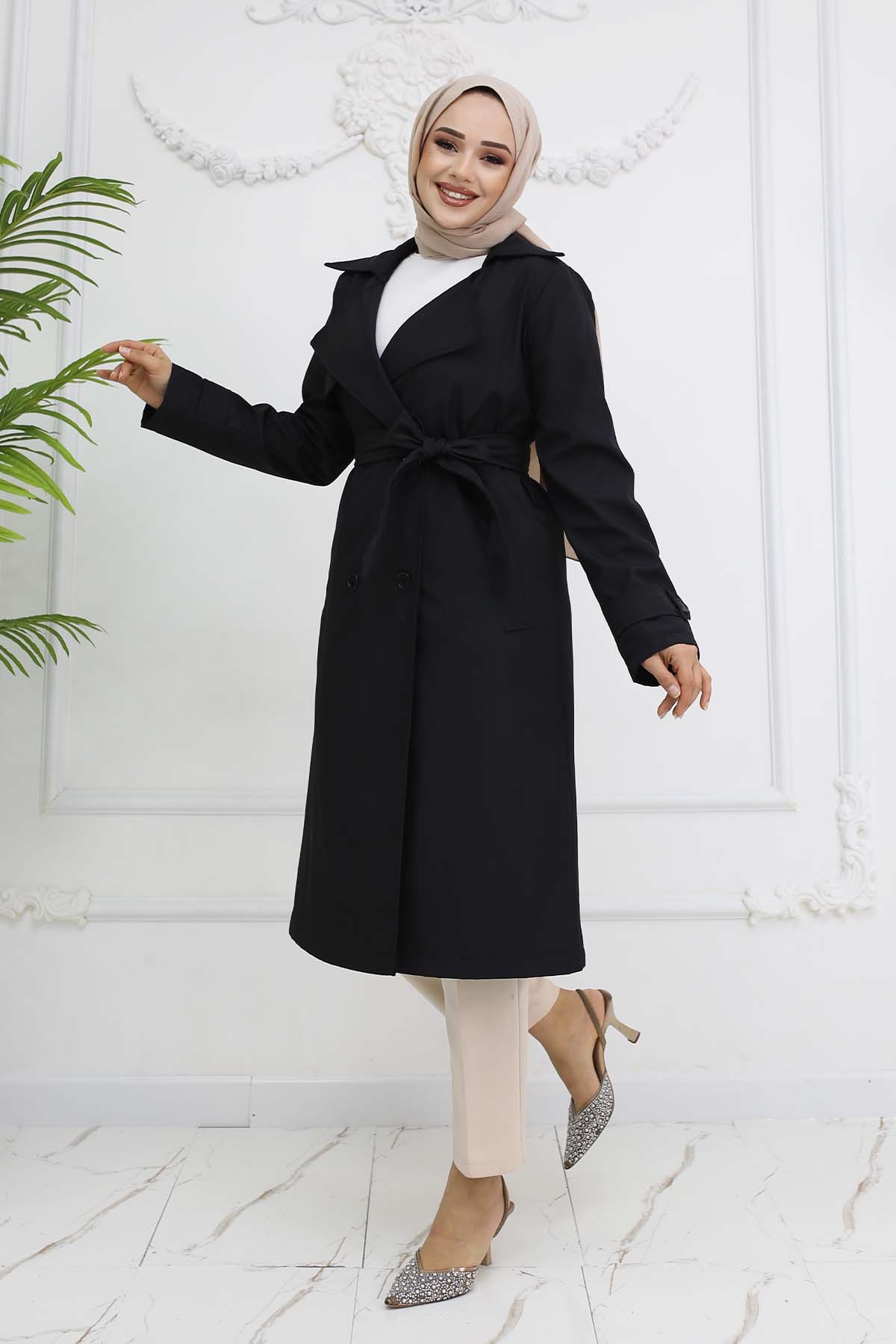 BNG Women Kuşaklı Kruvaze Yaka Trençkot Siyah 5918 - Calgary
