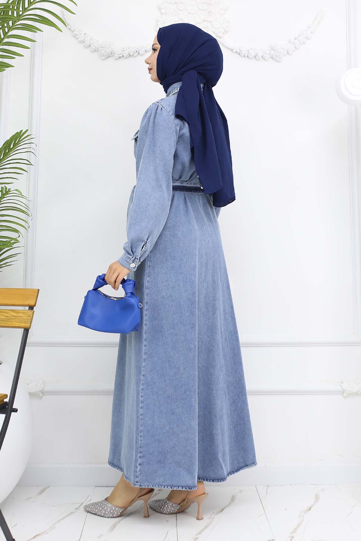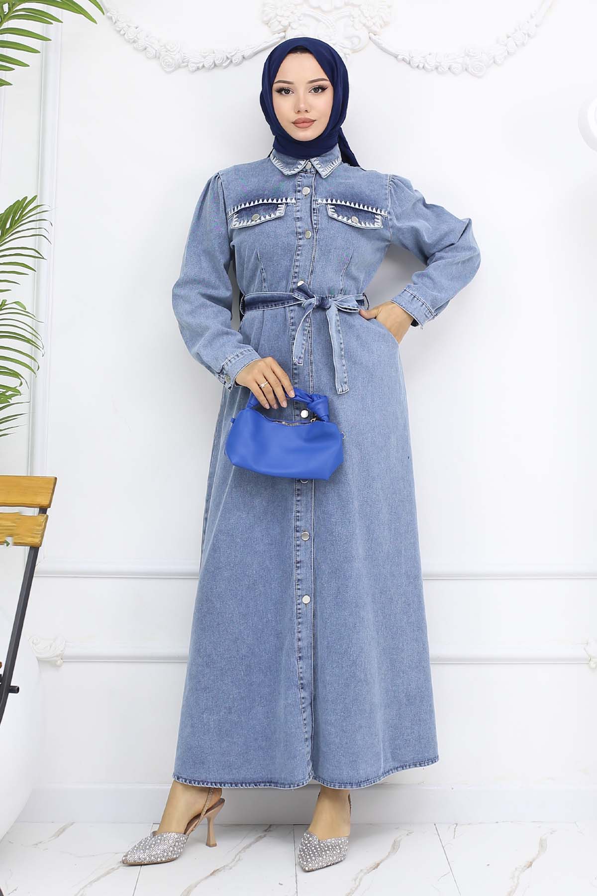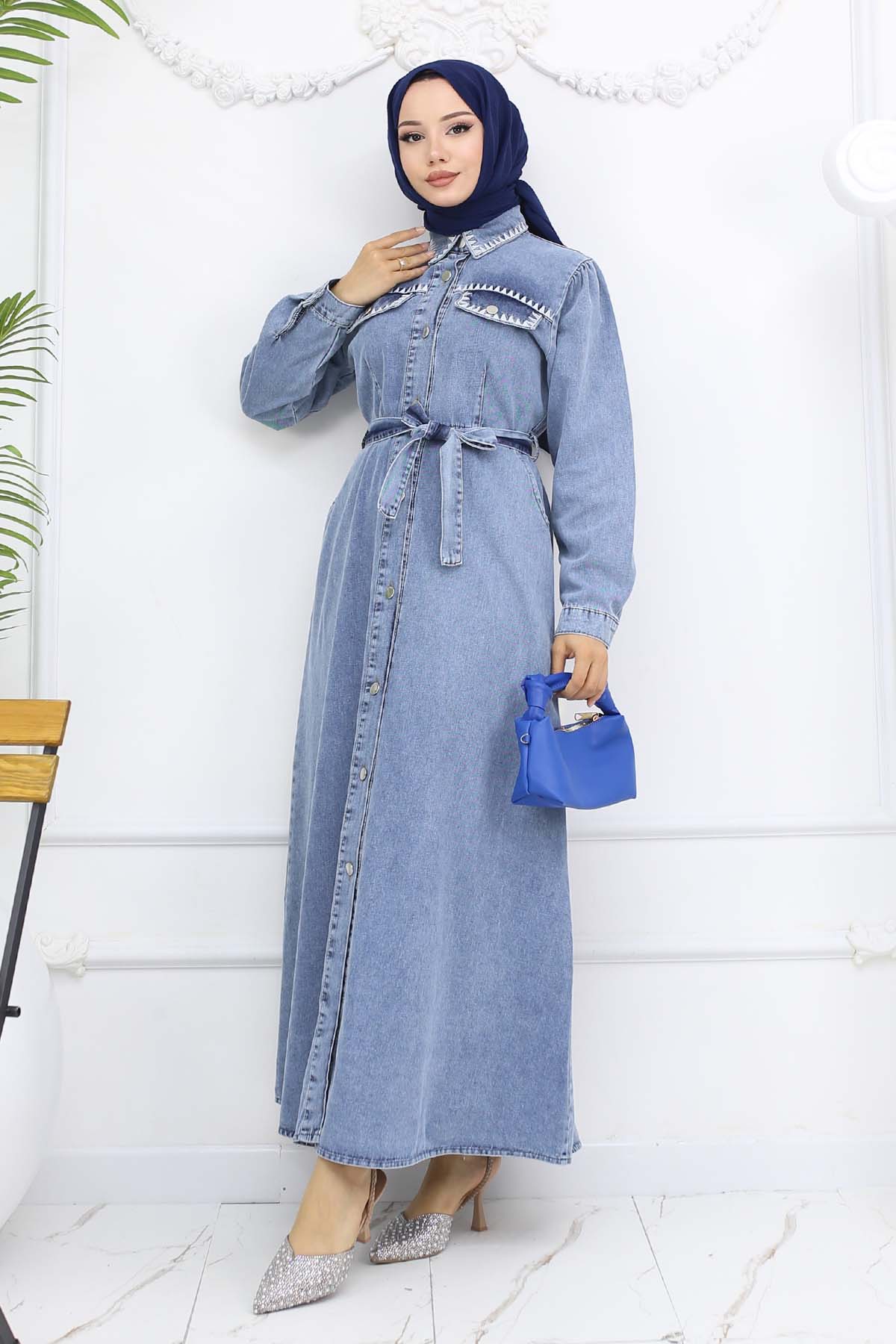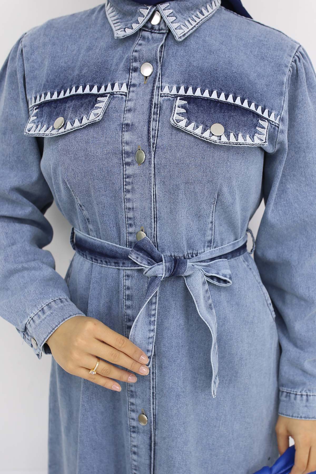 BNG Women Nakış Detaylı Kot Elbise Mavi 6108 - Emsdetten