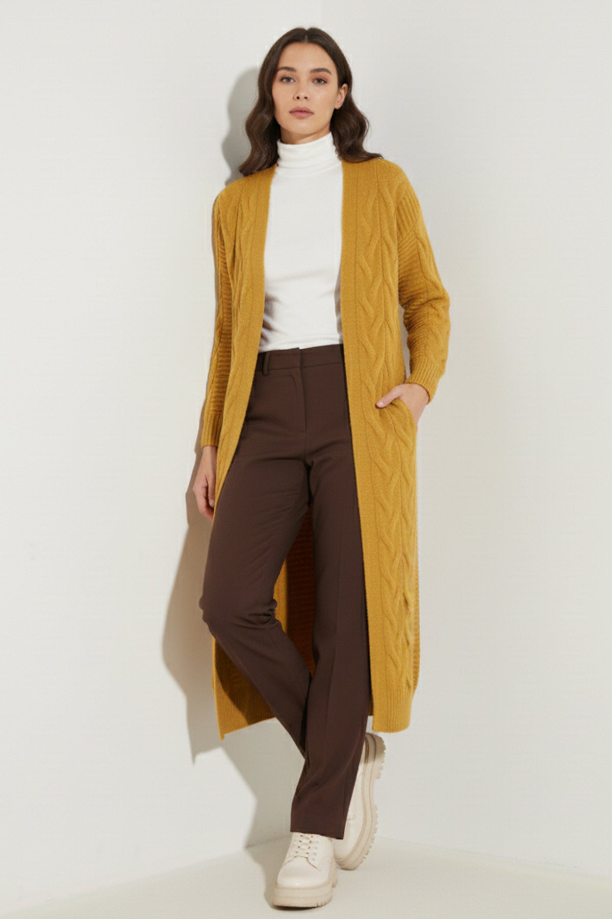 BNG Women Örgü Desenli Uzun Triko Hırka R2817 Hardal - Palm Harbor