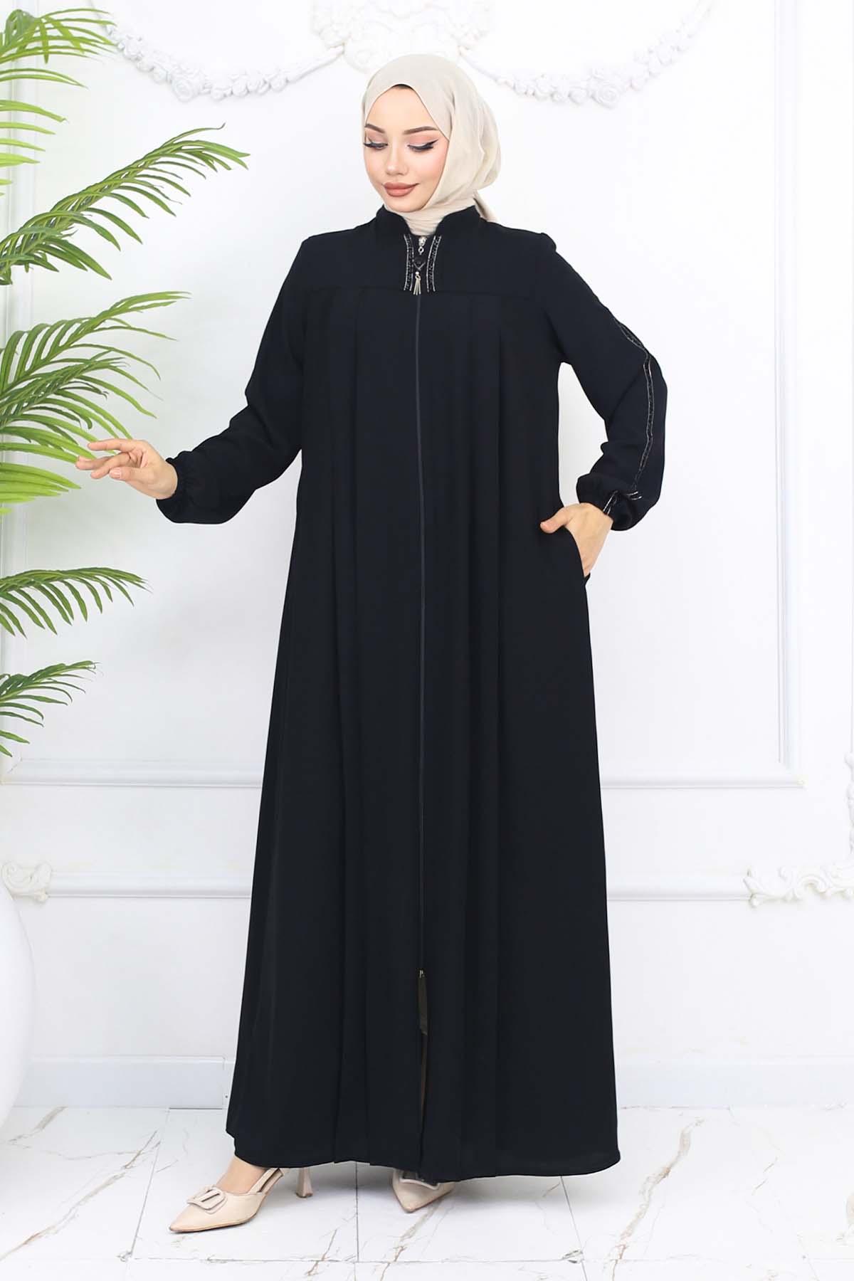 Our abaya has a zipper closure, is pocketed, and has shoulder pads.