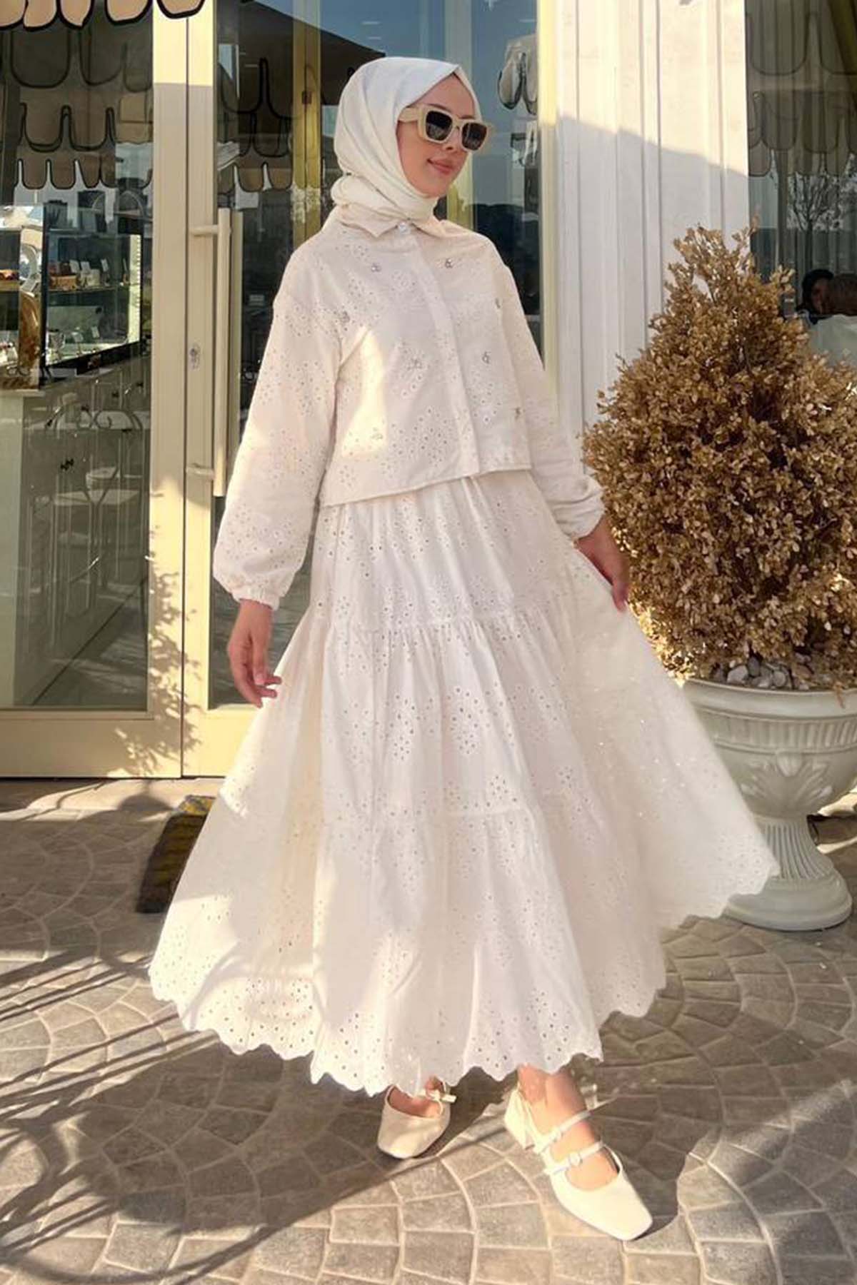 BNG Women Taş Detaylı Fisto Etekli Takım Krem 1427 - Dornbirn
