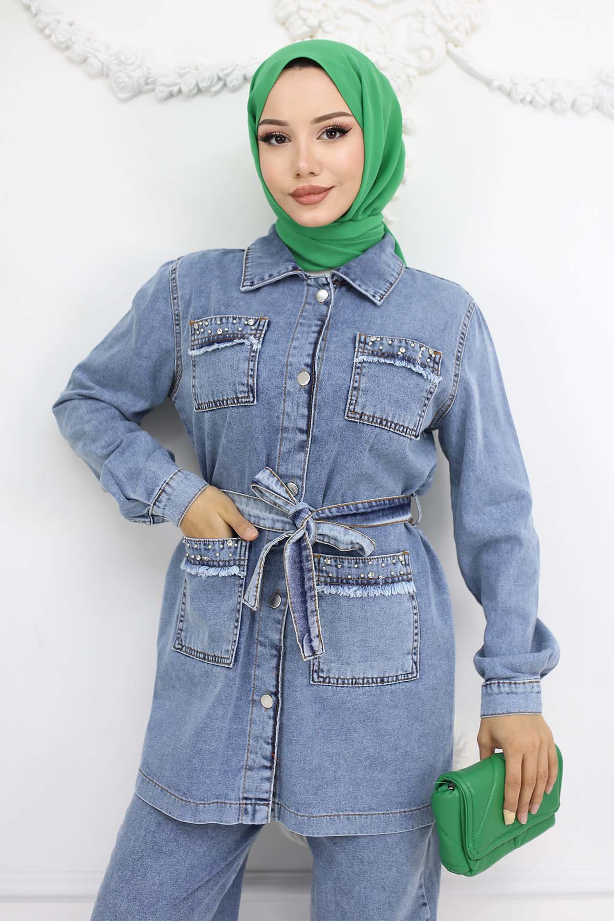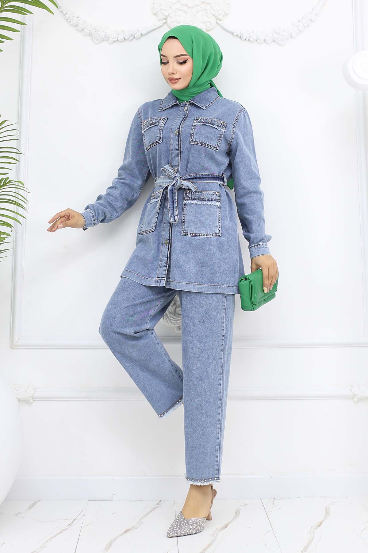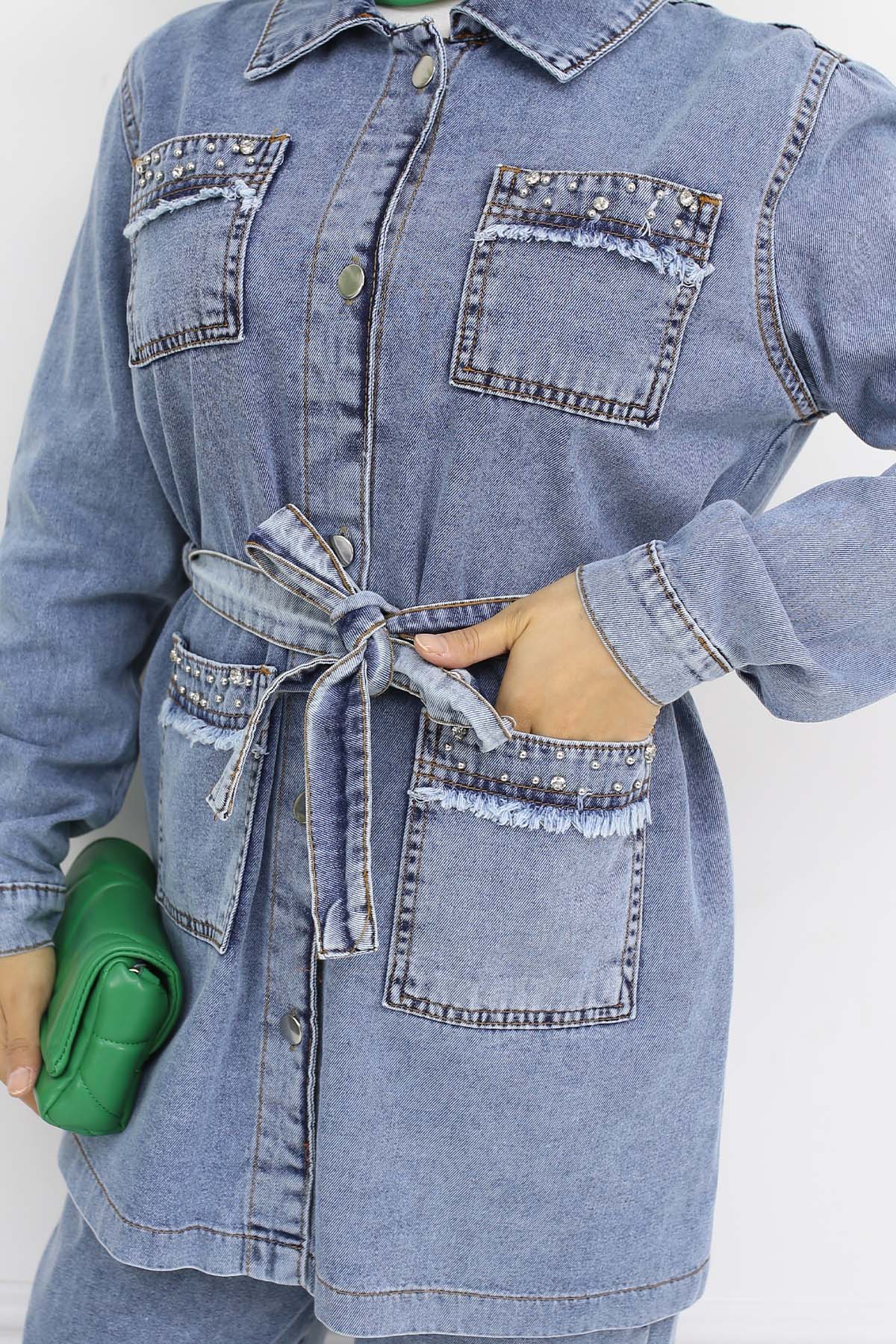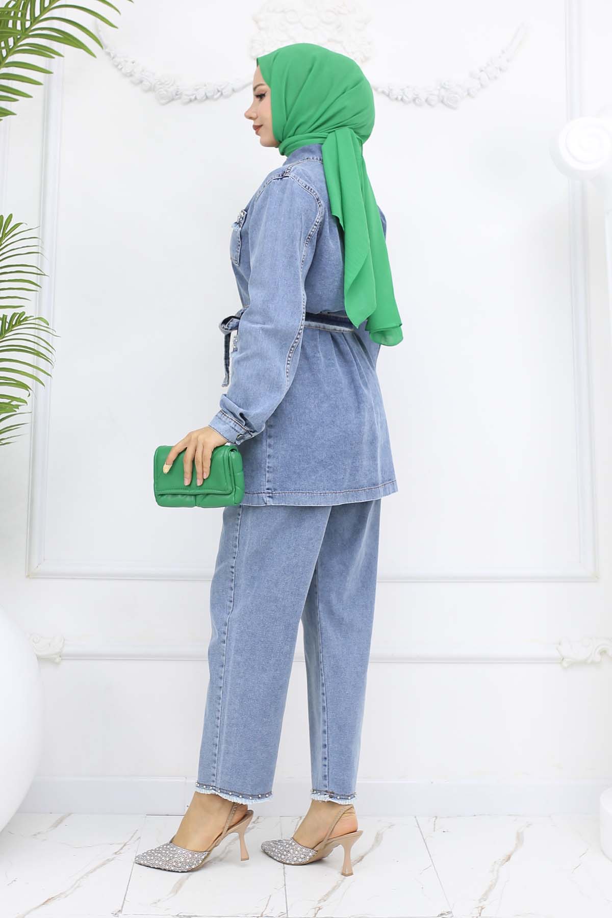 BNG Women Taş Detaylı Kuşaklı Kot Takım Mavi 2103 - Gloucester