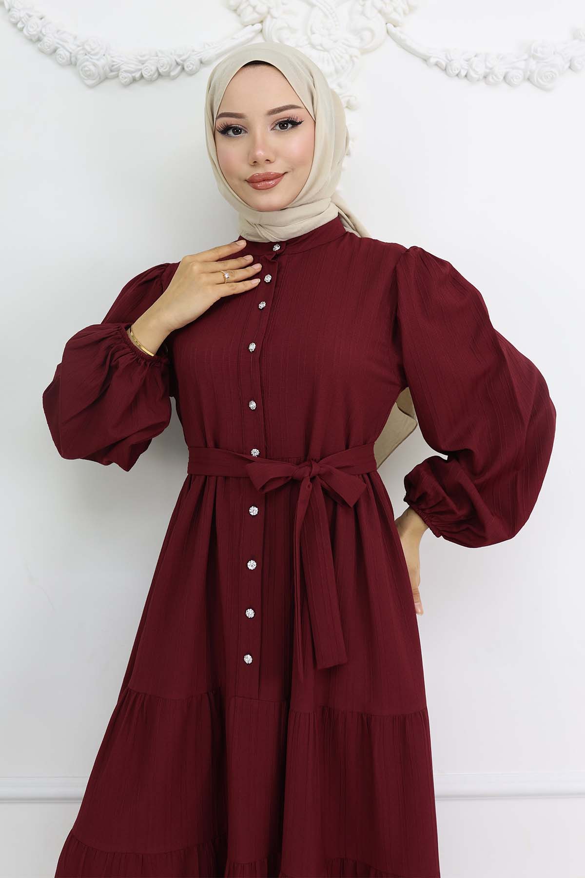BNG Women Taşlı Düğmeli Hakim Yaka Tesettür Elbise Bordo 2268 - Mooresville