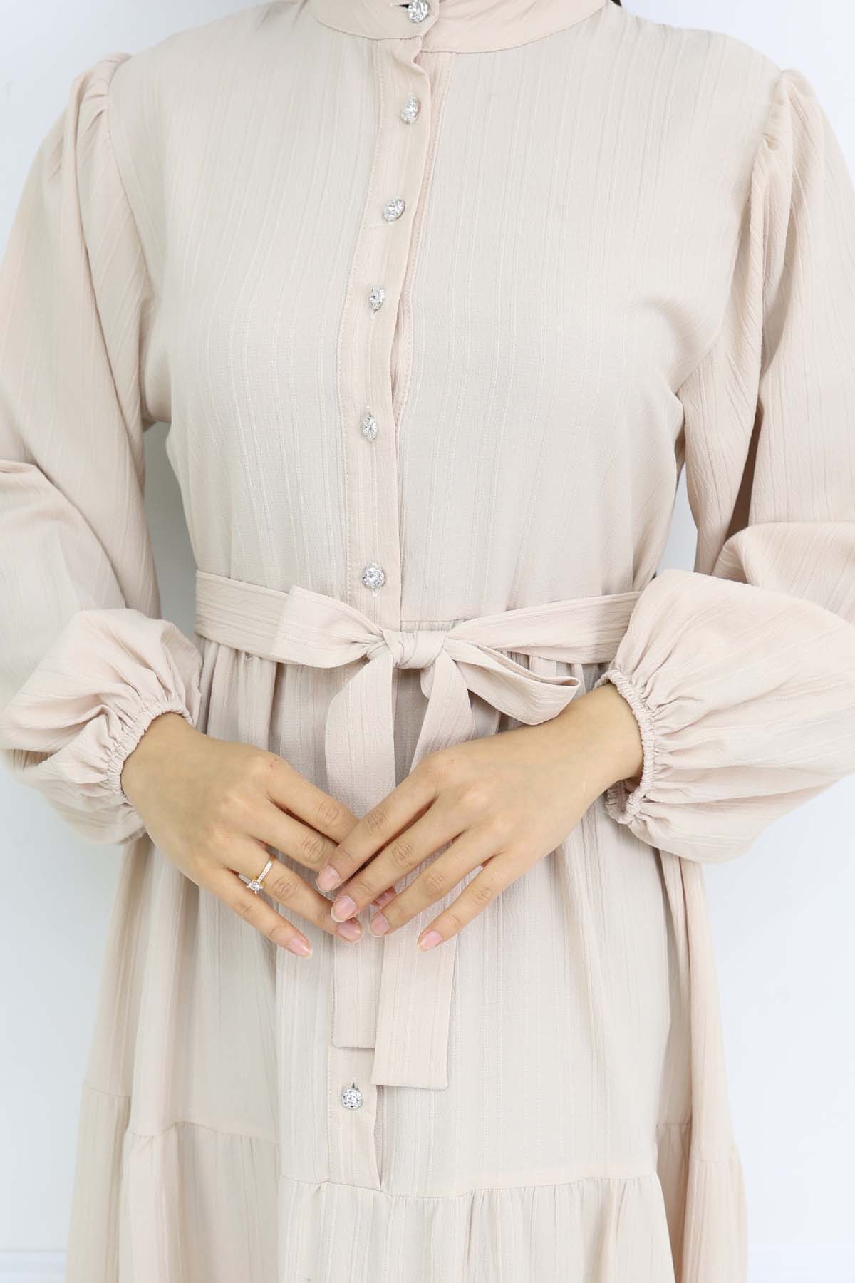 BNG Women Taşlı Düğmeli Hakim Yaka Tesettür Elbise Taş Rengi 2268 - Mukacheve