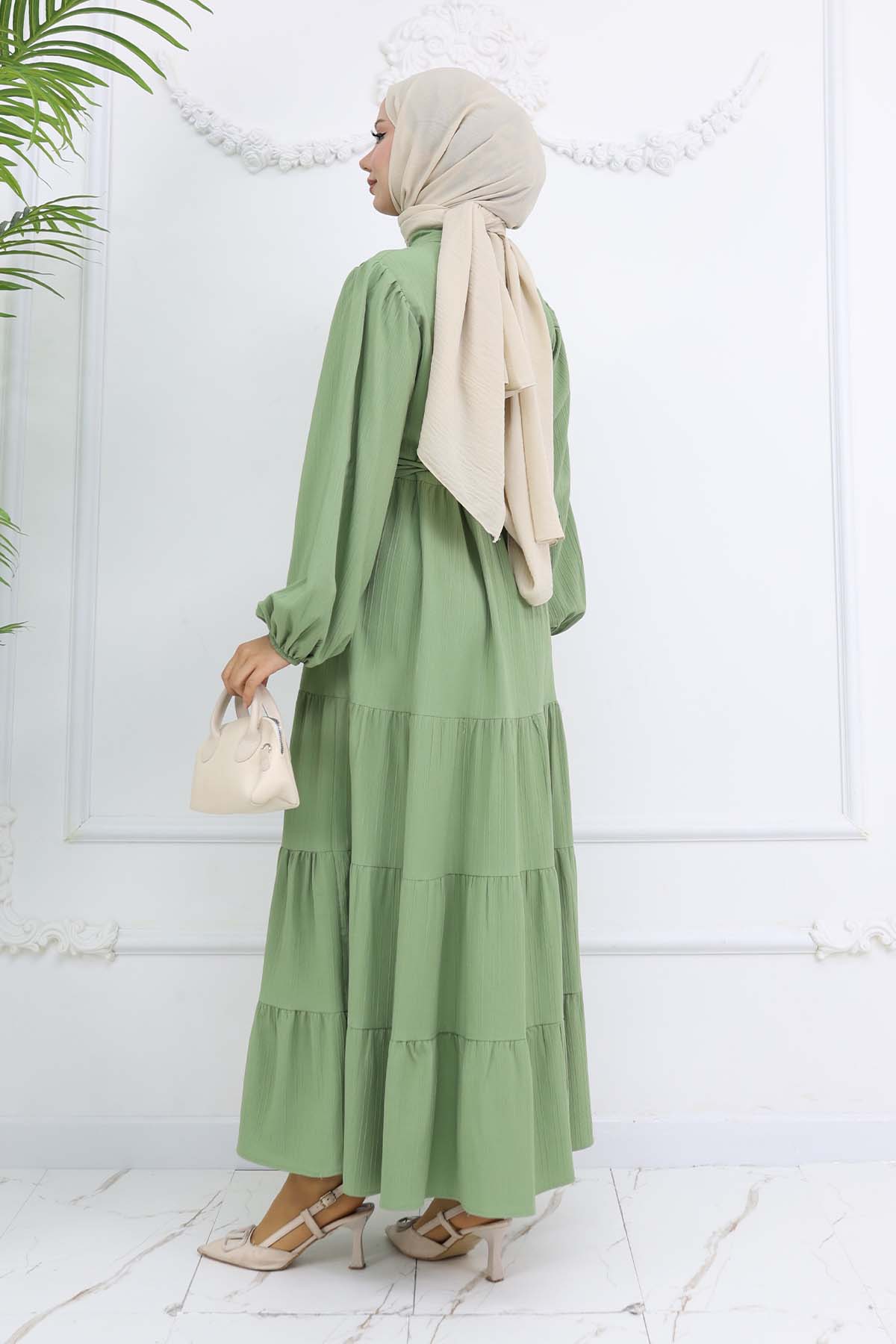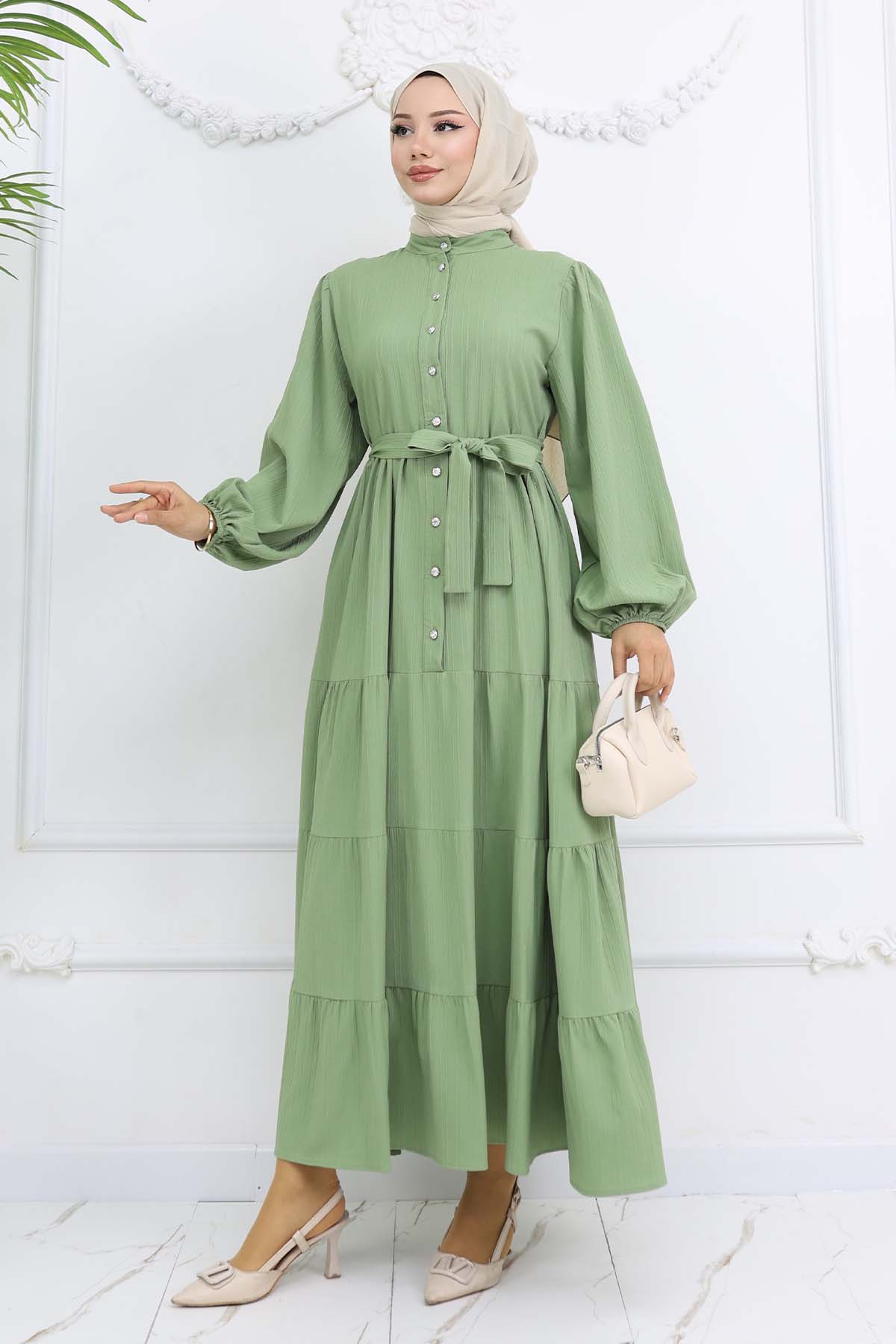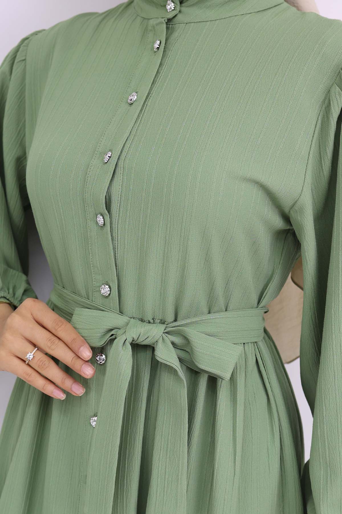 BNG Women Taşlı Düğmeli Hakim Yaka Tesettür Elbise Yeşil 2268 - Schertz