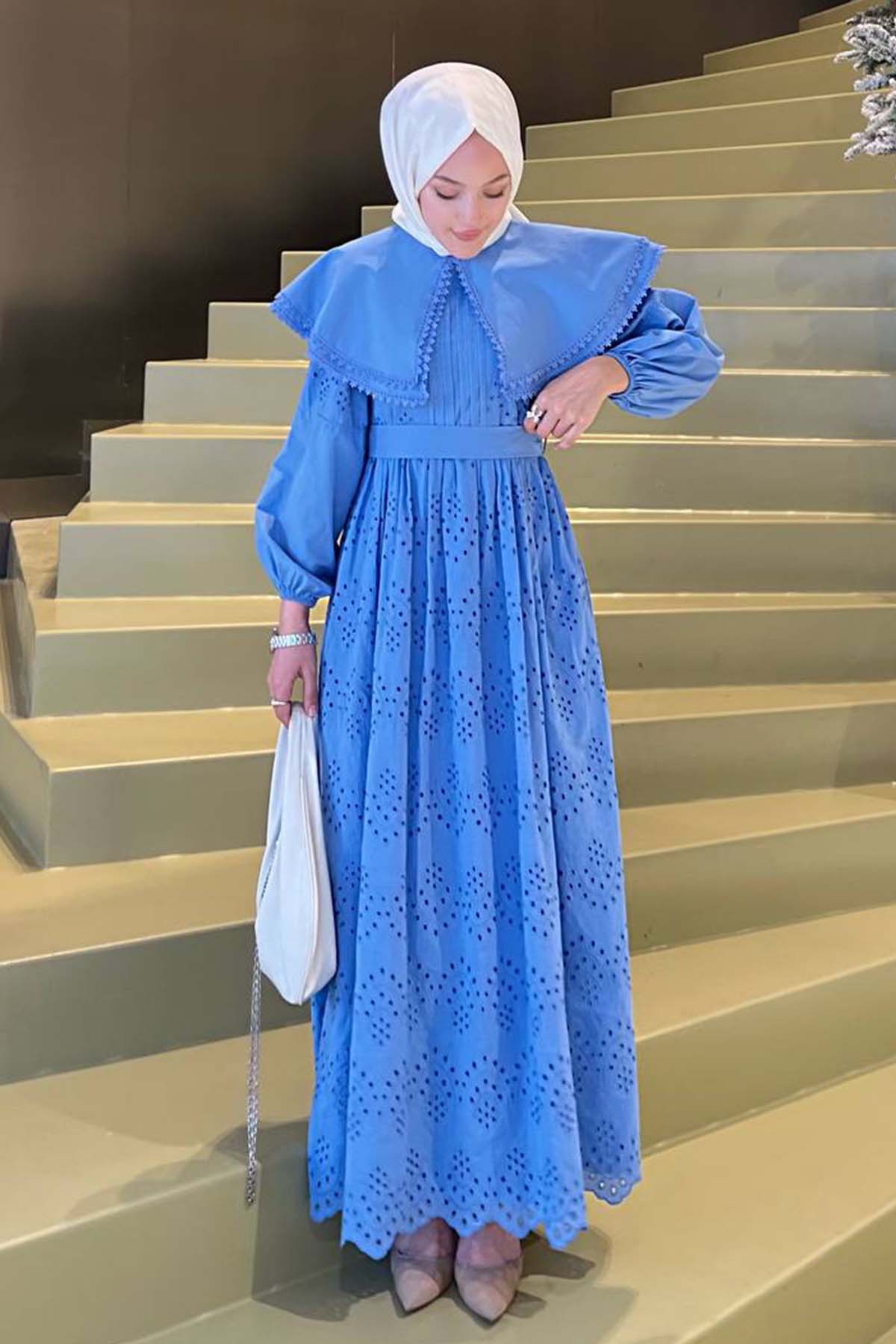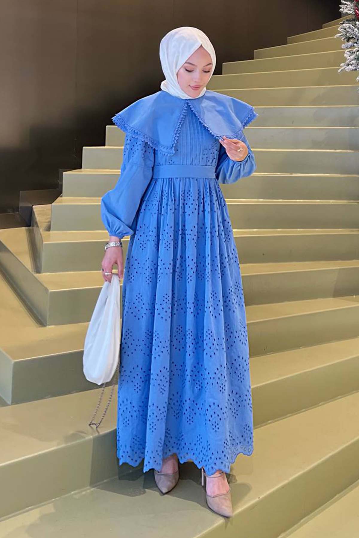 BNG Women Yaka Detaylı Dantelli Elbise Mavi 1421 - Suresnes